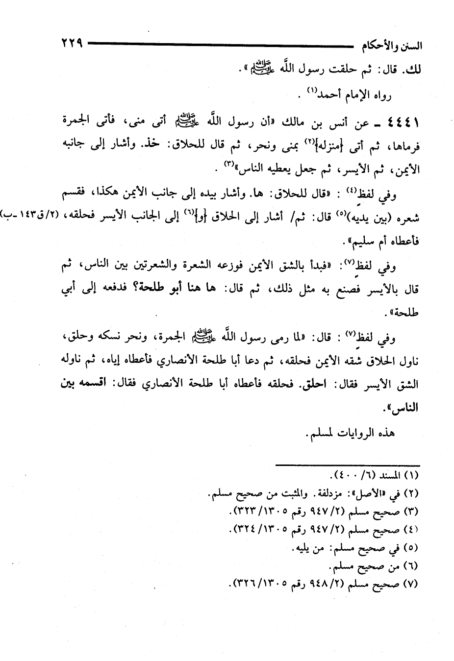 4441 - عن أنس بن مالك أن رسول الله - صلى الله عليه وسلم - أتى مني، فأتى الجمرة فرماها، ثم أتى (منزله) (¬2) بمنى ونحر، ثم قال للحلاق: خذ. وأشار إلى جانبه الأيمن، ثم الأيسر، ثم جعل يعطيه الناس" (¬3).