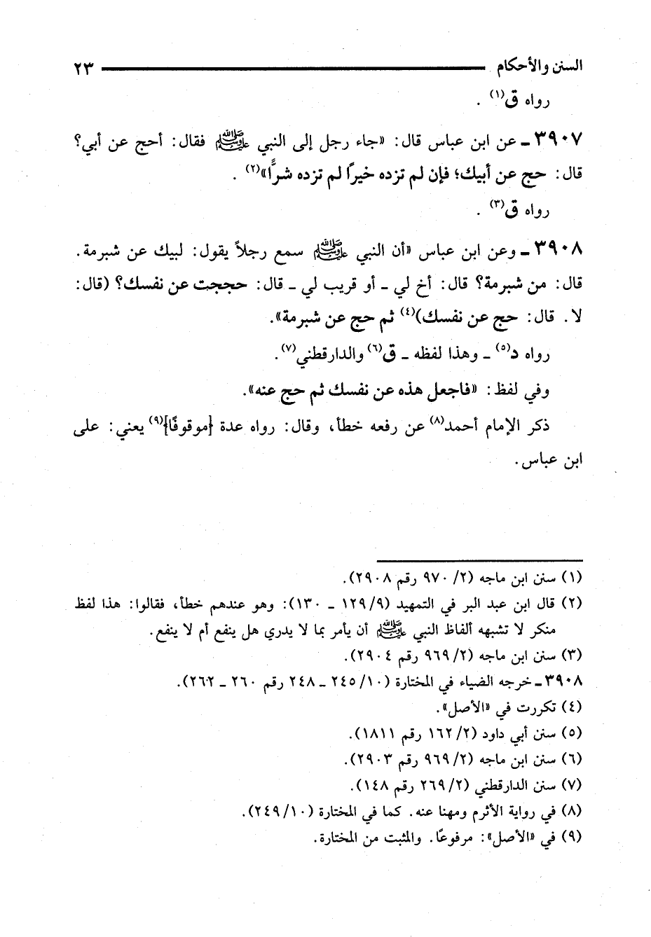 3908 - وعن ابن عباس "أن النبي - صلى الله عليه وسلم - سمع رجلاً يقول: لبيك عن شبرمة. قال: من شبرمة؟ قال: أخ لي -أو قريب لي- قال: حججت عن نفسك؟ (قال: لا. قال: حج عن نفسك) (¬4) ثم حج عن شبرمة".
