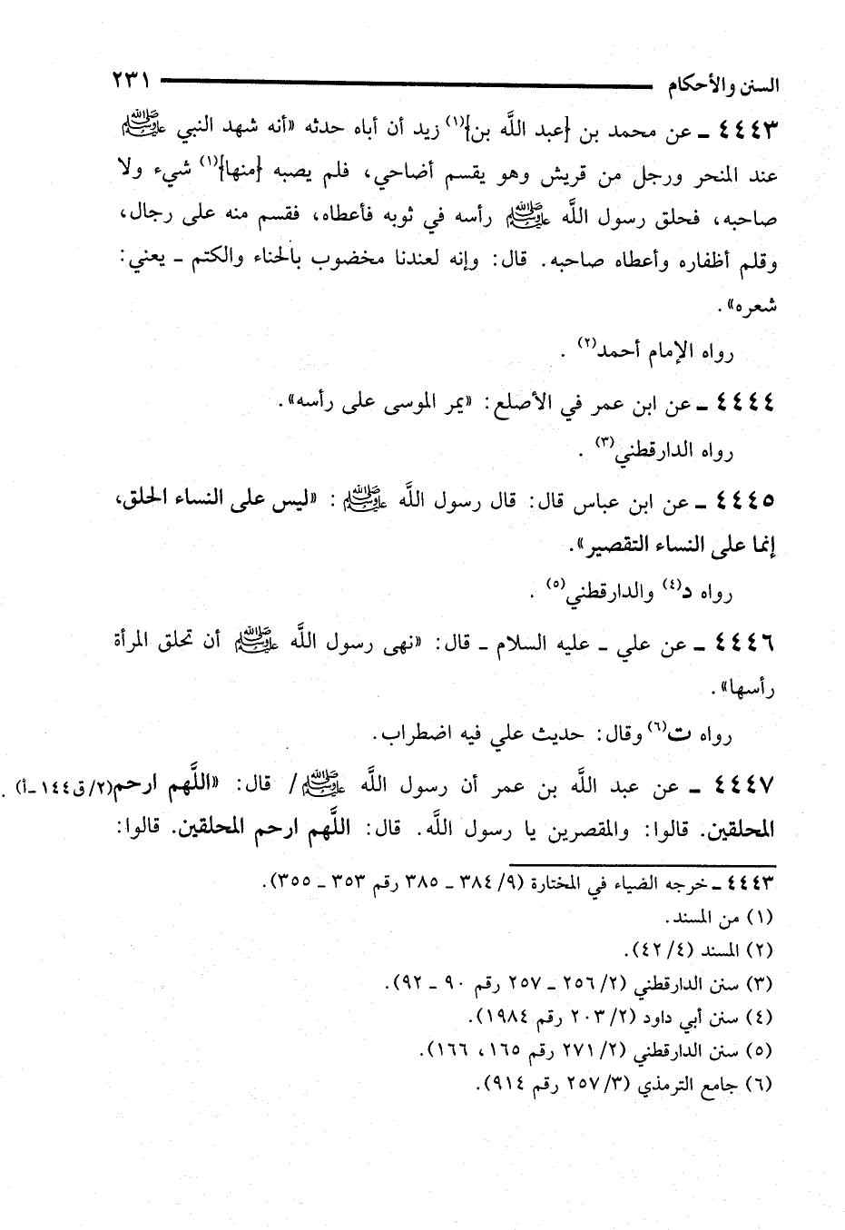 4446 - عن علي -رضي الله عنه- قال: "نهى رسول الله - صلى الله عليه وسلم - أن تحلق المرأة رأسها".