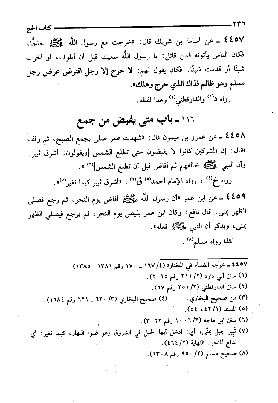 4457 - عن أسامة بن شريك قال: "خرجت مع رسول الله - صلى الله عليه وسلم - حاجًّا، فكان الناس يأتونه فمن قائل: يا رسول الله سعيت قبل أن أطوف، أو أخرت شيئًا أو قدمت شيئًا. فكان يقول لهم: لا حرج إلا رجل اقترض عرض رجل مسلم وهو ظالم فذاك الذي حرج وهلك".