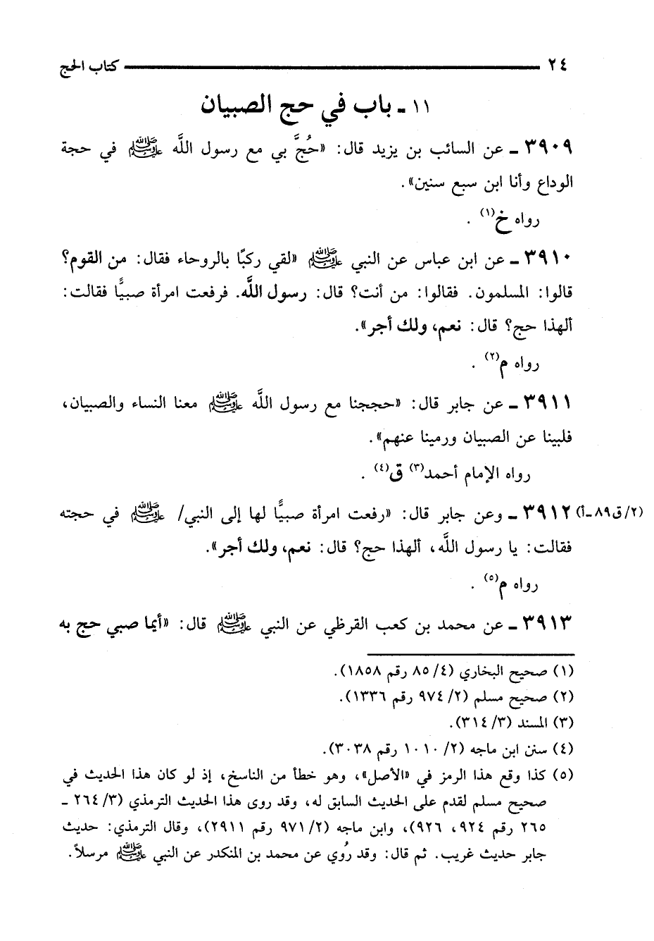 3911 - عن جابر قال: "حججنا مع رسول الله - صلى الله عليه وسلم - معنا النساء والصبيان، فلبينا عن الصبيان ورمينا عنهم".