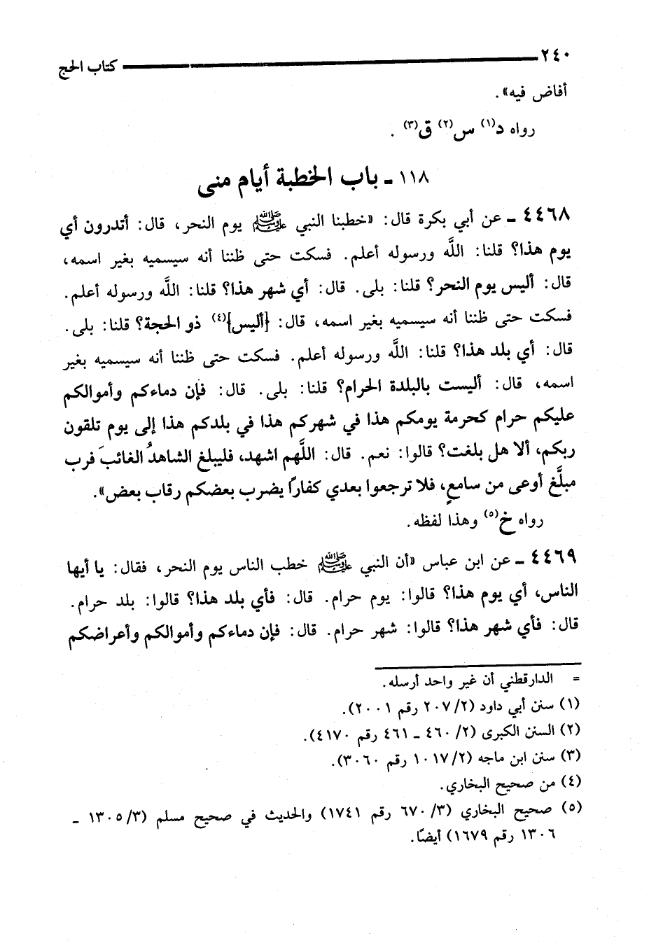 4469 - عن ابن عباس "أن النبي - صلى الله عليه وسلم - خطب الناس يوم النحر، فقال: يا أيها الناس، أي يوم هذا؟ قالوا: يوم حرام. قال: فأي بلد هذا؟ قالوا: بلد حرام. قال: فأي شهر هذا؟ قالوا: شهر حرام. قال: فإن دماءكم وأموالكم وأعراضكم
