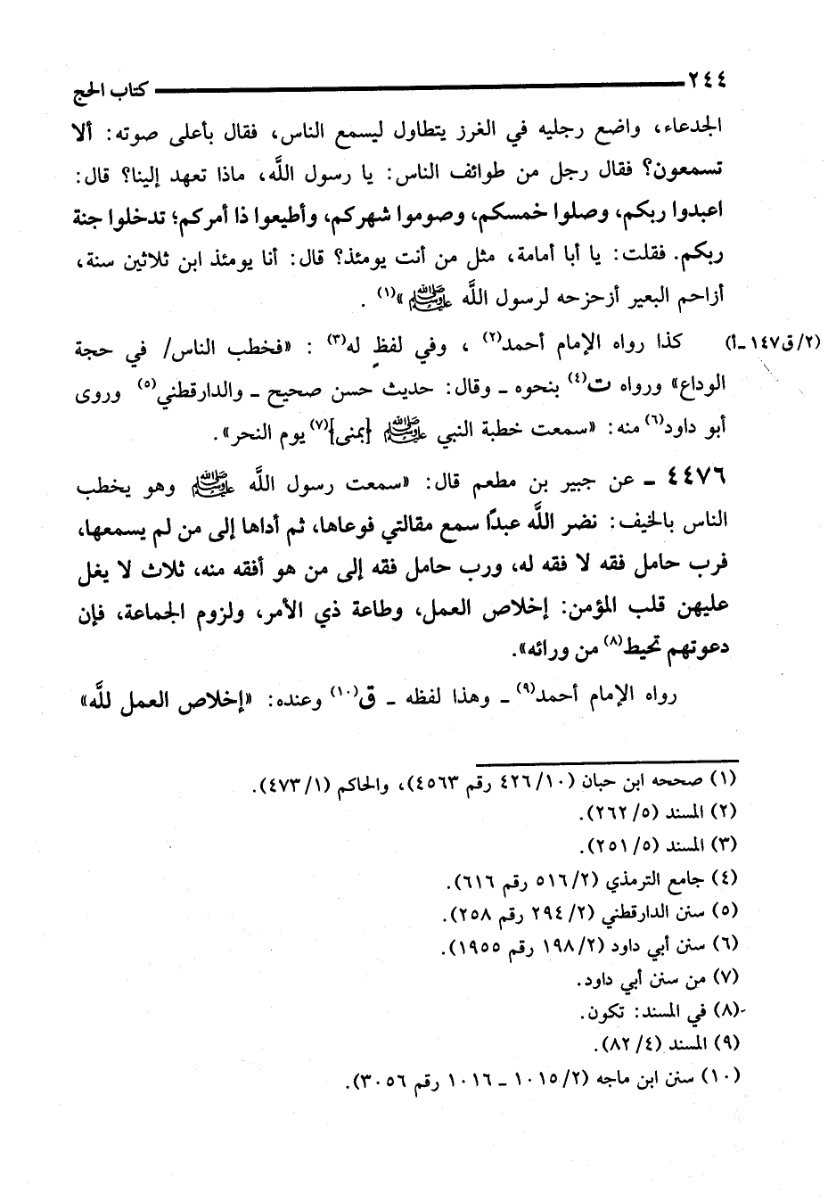 4476 - عن جبير بن مطعم قال: "سمعت رسول الله - صلى الله عليه وسلم - وهو يخطب الناس بالخيف: نضر الله عبداً سمع مقالتي فوعاها، ثم أداها إلى من لم يسمعها، فرب حامل فقه لا فقه له، ورب حامل فقه إلى من هو أفقه منه، ثلاث لا يغل عليهن قلب المؤمن: إخلاص العمل، وطاعة ذي الأمر، ولزوم الجماعة، فإن دعوتهم تحيط (¬8) من ورائه".