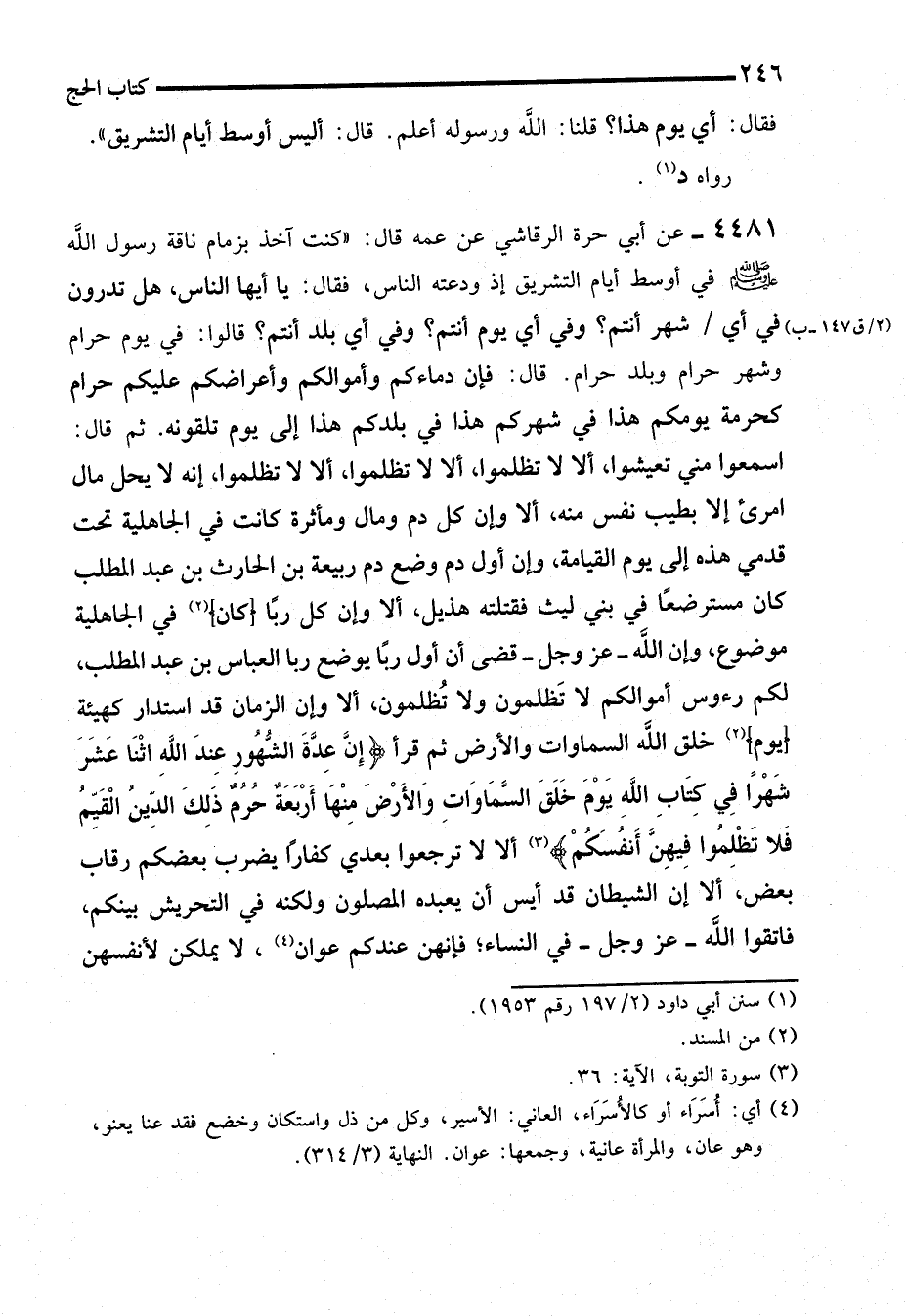 4481 - عن أبي حرة الرقاشي عن عمه قال: "كنت آخذ بزمام ناقة رسول الله - صلى الله عليه وسلم - في أوسط أيام التشريق إذ ودعته الناس، فقال: يا أيها الناس، هل تدرون في أي شهر أنتم؟ وفي أي يوم أنتم؟ وفي أي بلد أنتم؟ قالوا: في يوم حرام وشهر حرام وبلد حرام. قال: فإن دماءكم وأموالكم وأعراضكم عليكم حرام كحرمة يومكم هذا في شهركم هذا في بلدكم هذا إلى يوم تلقونه. ثم قال: اسمعوا مني تعيشوا، ألا لا تظلموا، ألا لا تظلموا، ألا لا تظلموا، إنه لا يحل مال امرئ إلا بطيب نفس منه، ألا وإن كل دم ومال ومأثرة كانت في الجاهلية تحت قدمي هذه إلى يوم القيامة، وإن أول دم وضع دم ربيعة بن الحارث بن عبد المطلب كان مسترضعًا في بني ليث فقتلته هذيل، ألا وإن كل (ربًا) (كان) (¬2) في الجاهلية موضوع، وإن الله -عز وجل- قضى أن أول ربًا يوضع ربا العباس بن عبد المطلب، لكم رءوس أموالكم لا تَظلمون ولا تُظلمون، ألا وإن الزمان قد استدار كهيئة (يوم) (2) خلق الله السماوات والأرض ثم قرأ {إِنَّ عِدَّةَ الشُّهُورِ عِنْدَ اللَّهِ اثْنَا عَشَرَ شَهْرًا فِي كِتَابِ اللَّهِ يَوْمَ خَلَقَ السَّمَاوَاتِ وَالْأَرْضَ مِنْهَا أَرْبَعَةٌ حُرُمٌ ذَلِكَ الدِّينُ الْقَيِّمُ فَلَا تَظْلِمُوا فِيهِنَّ أَنْفُسَكُمْ} (¬3) ألا لا ترجعوا بعدي كفاراً يضرب بعضكم رقاب بعض، ألا إن الشيطان قد أيس أن يعبده المصلون ولكنه في التحريش بينكم، فاتقوا الله -عز وجل- في النساء؛ فإنهن عندكم عوان (¬4)، لا يملكن لأنفسهن