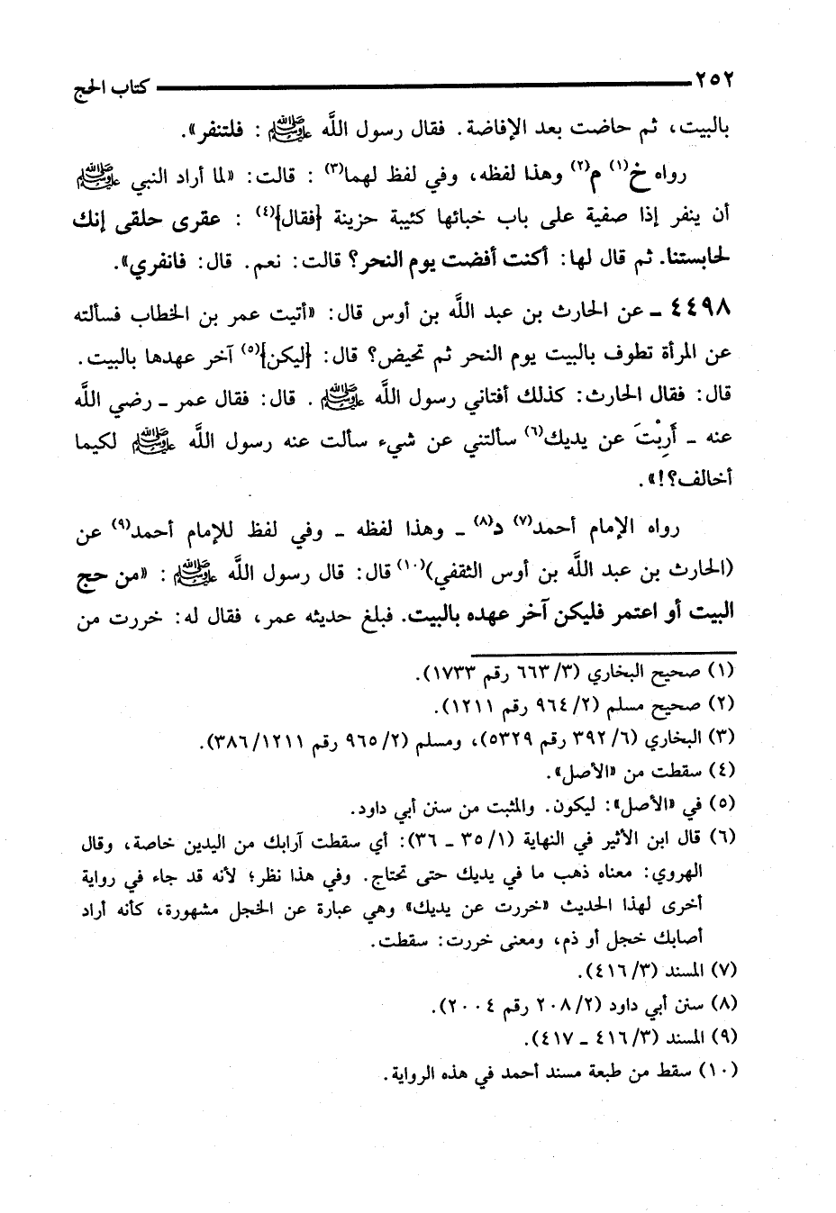 4498 - عن الحارث بن عبد الله بن أوس قال: "أتيت عمر بن الخطاب فسألته عن المرأة تطوف بالبيت يوم النحر ثم تحيض؟ قال: (ليكن) (¬5) آخر عهدها بالبيت. قال: فقال الحارث: كذلك أفتاني رسول الله - صلى الله عليه وسلم - قال: فقال عمر -رضي الله عنه- أَرِيتَ عن يديك (¬6) سألتني عن شيء سألت عنه رسول الله - صلى الله عليه وسلم - لكيما أخالف؟! ".