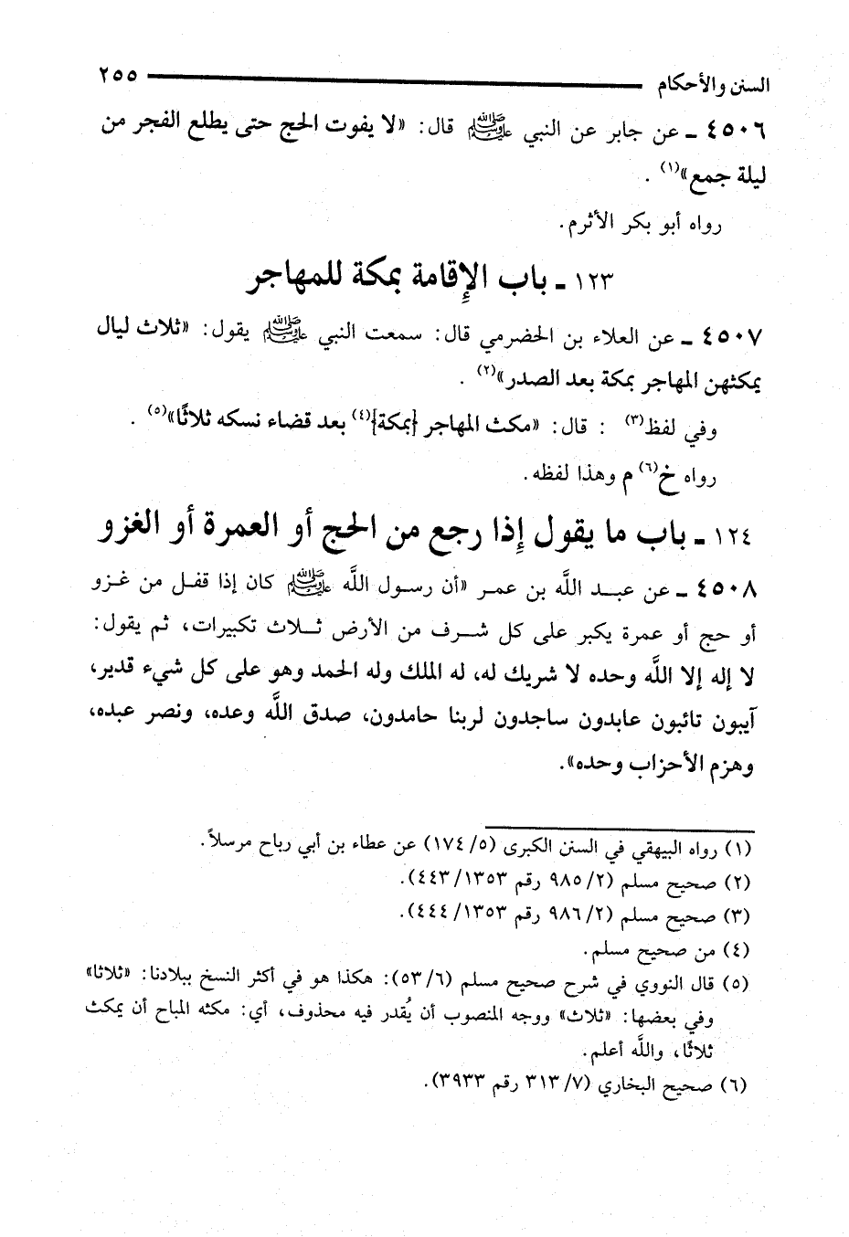 4507 - عن العلاء بن الحضرمي قال: سمعت النبي - صلى الله عليه وسلم - يقول: "ثلاث ليال يمكثهن المهاجر بمكة بعد الصدر" (¬2).