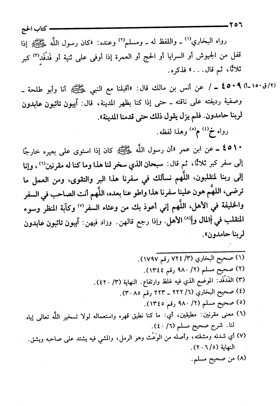 4509 - عن أنس بن مالك قال: "أقبلنا مع النبي - صلى الله عليه وسلم - أنا وأبو طلحة -وصفية رديفته على ناقته- حتى إذا كنا بظهر المدينة، قال: آيبون تائبون عابدون لربنا حامدون. فلم يزل يقول ذلك حتى قدمنا المدينة".