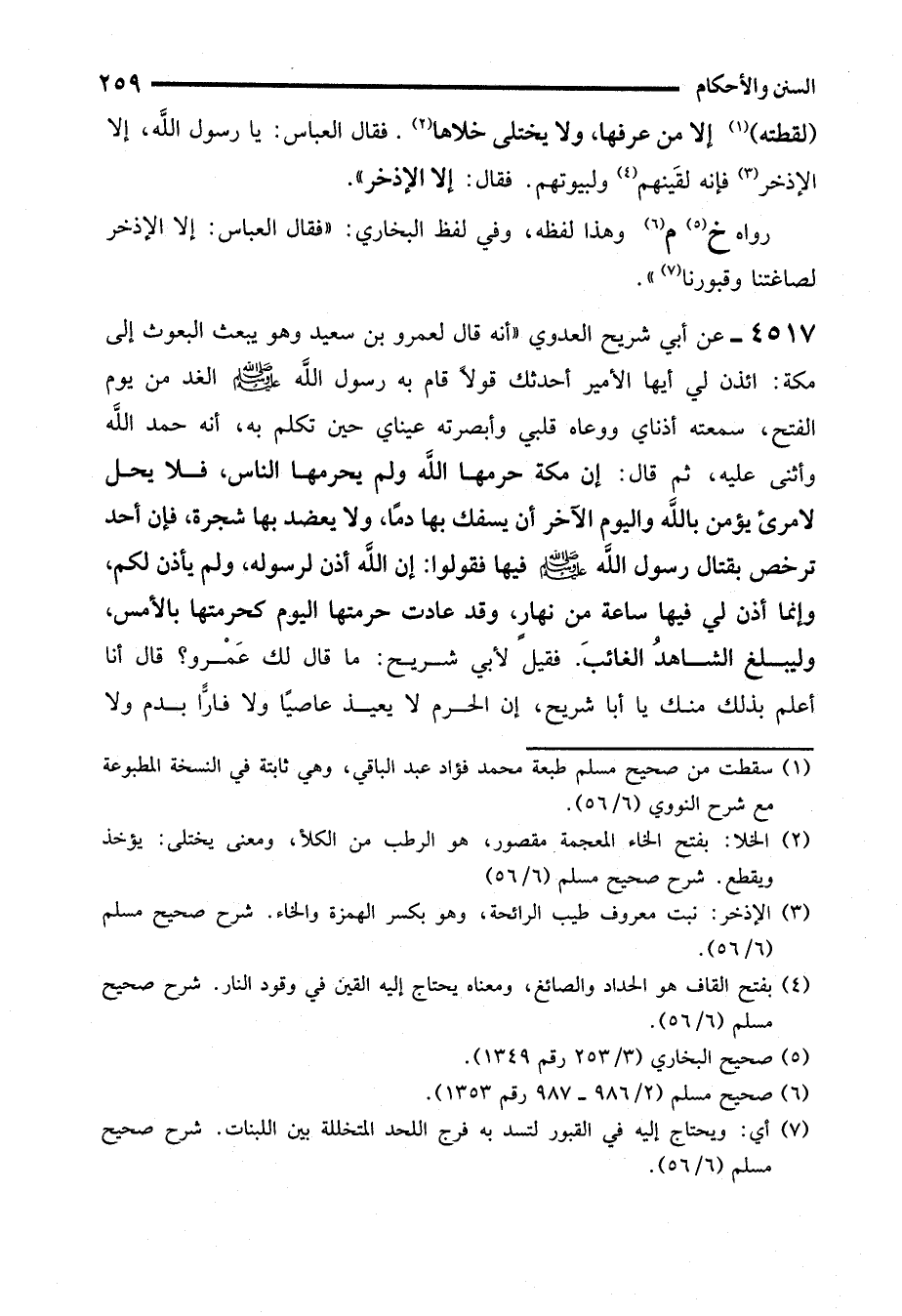 4517 - عن أبي شريح العدوي "أنه قال لعمرو بن سعيد وهو يبعث البعوث إلى مكة: ائذن لي أيها الأمير أحدثك قولاً قام به رسول الله - صلى الله عليه وسلم - الغد من يوم الفتح، سمعته أذناي ووسماه قلبي وأبصرته عيناي حين تكلم به، أنه حمد الله وأثنى عليه، ثم قال: إن مكة حرمها الله ولم يحرمها الناس، فلا يحل لامرئ يؤمن باللَّه واليوم الآخر أن يسفك بها دمًا، ولا يعضد بها شجرة، فإن أحد ترخص بقتال رسول الله - صلى الله عليه وسلم - فيها فقولوا: إن الله أذن لرسوله، ولم يأذن لكم، وإنما أذن لي فيها ساعة من نهارٍ، وقد عادت حرمتها اليوم كحرمتها بالأمس، وليبلغ الشاهدُ الغائبَ. فقيل لأبي شريح: ما قال لك عَمْرو؟ قال أنا أعلم بذلك منك يا أبا شريح، إن الحرم لا يعيذ عاصيًا ولا فارًّا بدم ولا