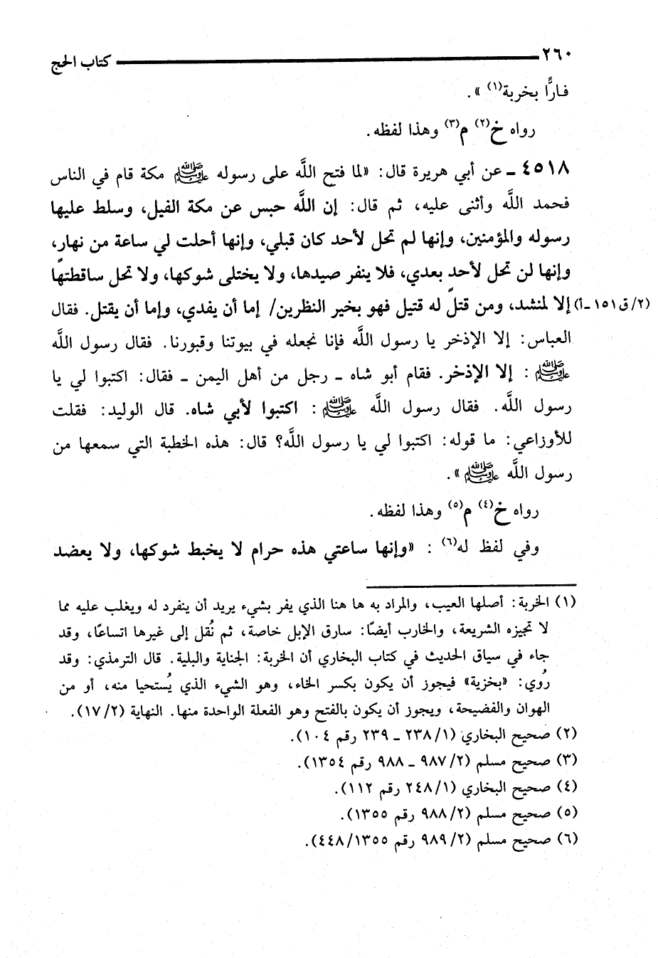 4518 - عن أبي هريرة قال: "لما فتح الله على رسوله - صلى الله عليه وسلم - مكة قام في الناس فحمد الله وأثنى عليه، ثم قال: إن الله حبس عن مكة الفيل، وسلط عليها رسوله والمؤمنين، وإنها لم تحل لأحد كان قبلي، وإنها أحلت لي ساعة من نهارٍ، وإنها لن تحل لأحدٍ بعدي، فلا ينفر صيدها، ولا يختلى شوكها، ولا تحل ساقطتها إلا لمنشد، ومن قتل له قتيل فهو بخير النظرين إما أن يفدي، وإما أن يقتل. فقال العباس: إلا الإذخر يا رسول الله فإنا نجعله في بيوتنا وقبورنا. فقال رسول الله - صلى الله عليه وسلم -: إلا الإذخر. فقام أبو شاه -رجل من أهل اليمن- فقال: اكتبوا لي يا رسول الله. فقال رسول الله - صلى الله عليه وسلم -: اكتبوا لأبي شاه. قال الوليد: فقلت للأوزاعي: ما قوله: اكتبوا لي يا رسول الله؟ قال: هذه الخطبة التي سمعها من رسول الله - صلى الله عليه وسلم -".