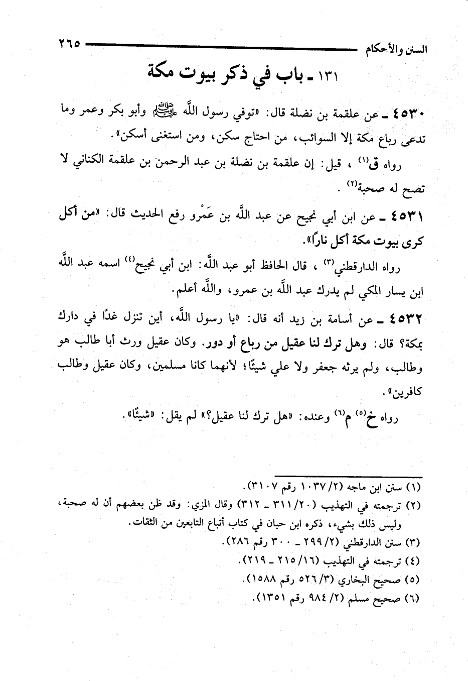 4530 - عن علقمة بن نضلة قال: توفي رسول الله - صلى الله عليه وسلم - وأبو بكر وعمر وما تدعى رباع مكة إلا السوائب، من احتاج سكن، ومن استغنى أسكن".