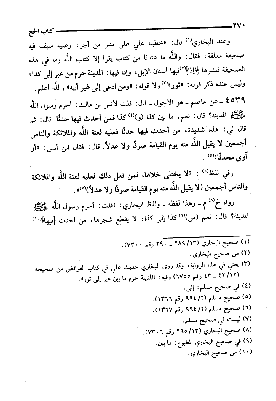 4539 - عن عاصم -هو الأحول- قال: قلت لأنس بن مالك: أحرم رسول الله - صلى الله عليه وسلم - المدينة؟ قال: نعم، ما بين كذا (و) (¬4) كذا فمن أحدث فيها حدثًا. قال: ثم قال لي: هذه شديدة، من أحدث فيها حدثًا فعليه لعنة الله والملائكة والناس أجمعين لا يقبل الله منه يوم القيامة صرفاً ولا عدلاً. قال: فقال ابن أنس: "أو آوى محدثاً" (¬5).