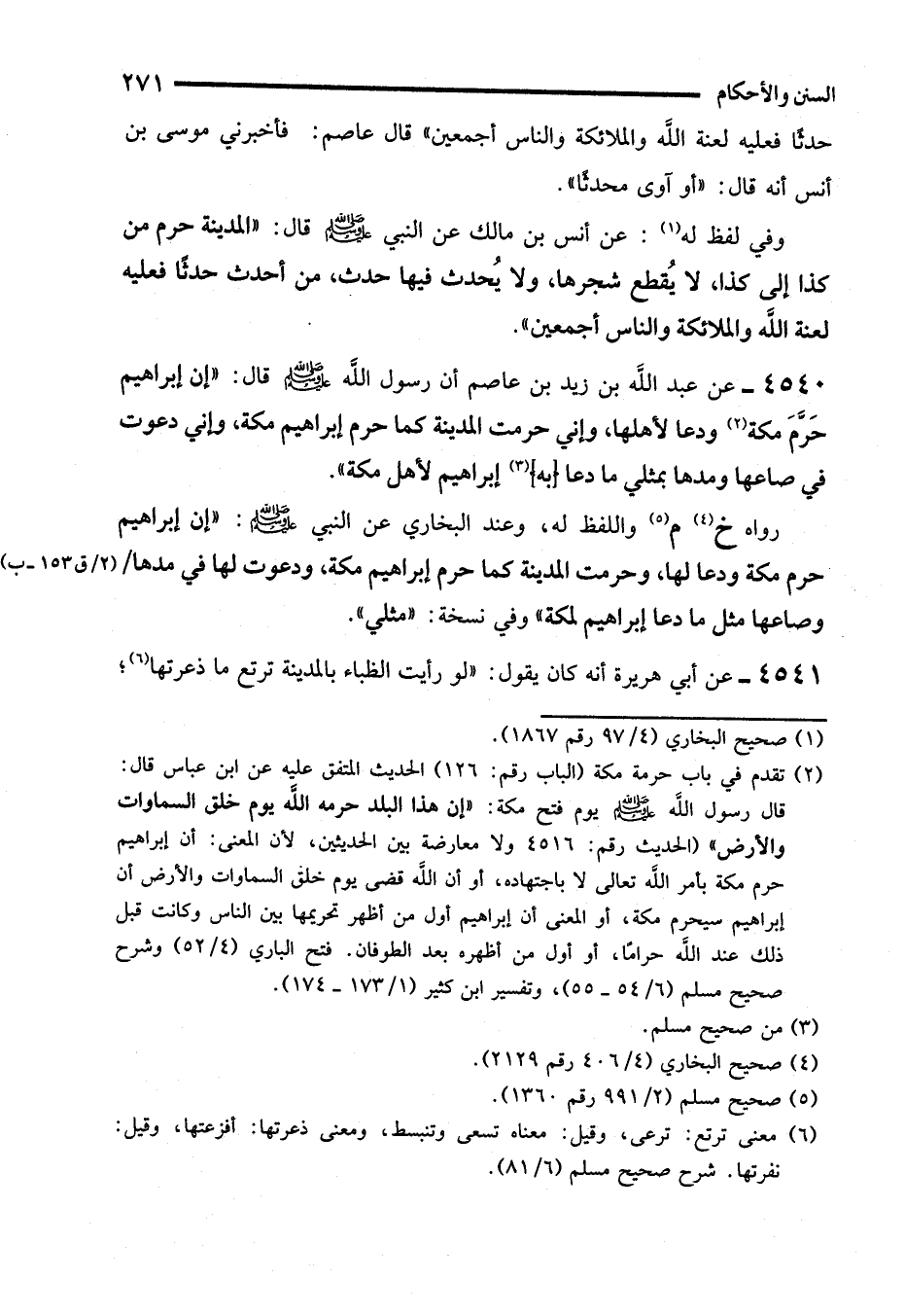 (¬2) تقدم في باب حرمة مكة (الباب رقم: 126) الحديث المتفق عليه عن ابن عباس قال: قال رسول الله - صلى الله عليه وسلم - يوم فتح مكة: "إن هذا البلد حرمه الله يوم خلق السماوات والأرض" (الحديث رقم: 4516 ولا معارضة بين الحديثين، لأن المعنى: أن إبراهيم حرم مكة بأمر الله تعالى لا باجتهاده، أو أن الله قضى يوم خلق السماوات والأرض أن إبراهيم سيحرم مكة، أو المعنى أن إبراهيم أول من أظهر تحريمها بين الناس وكانت قبل ذلك عند الله حراماً، أو أول من أظهره بعد الطوفان. فتح الباري (4/ 52) وشرح صحيح مسلم (6/ 54 - 55)، وتفسير ابن كثير (1/ 173 - 174).
