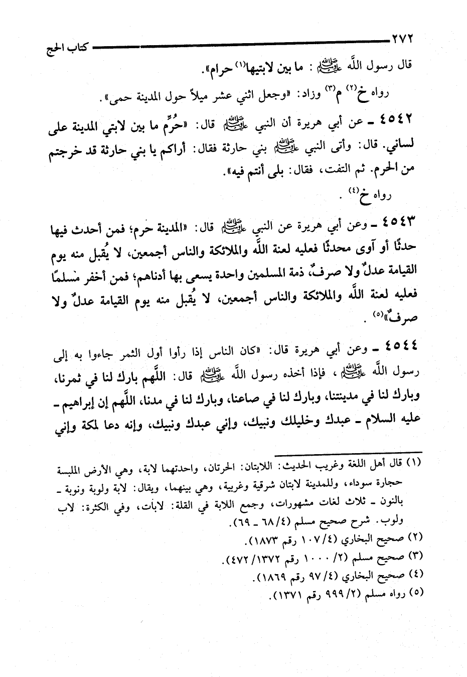 4543 - وعن أبي هريرة عن النبي - صلى الله عليه وسلم - قال: "المدينة حرم؛ فمن أحدث فيها حدثنا أو آوى محدثًا فعليه لعنة الله والملائكة والناس أجمعين، لا يُقبل منه يوم القيامة عدلٌ ولا صرفٌ، ذمة المسلمين واحدة يسعى بها أدناهم؛ فمن أخفر مسلماً فعليه لعنة الله والملائكة والناس أجمعين، لا يُقبل منه يوم القيامة عدلٌ ولا صرفٌ" (¬5).