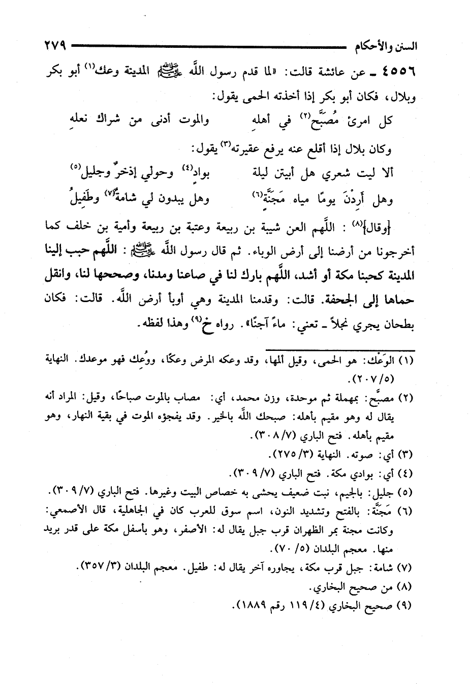 (وقال) (¬8): اللهم العن شيبة بن وبيعة وعتبة بن ربيعة وأمية بن خلف كما أخرجونا من أرضنا إلى أرض الوباء. ثم قال رسول الله - صلى الله عليه وسلم - اللهم حبب إلينا المدينة كحبنا مكة أو أشد، اللهم بارك لنا في صاعنا ومدنا، وصححها لنا، وانقل حماها إلى الجحفة. قالت: وقدمنا المدينة وهي أوبأ أرض الله. قالت: فكان بطحان يجري نجلاً- تعني: ماءً آجنا". رواه خ (¬9) وهذا لفظه.