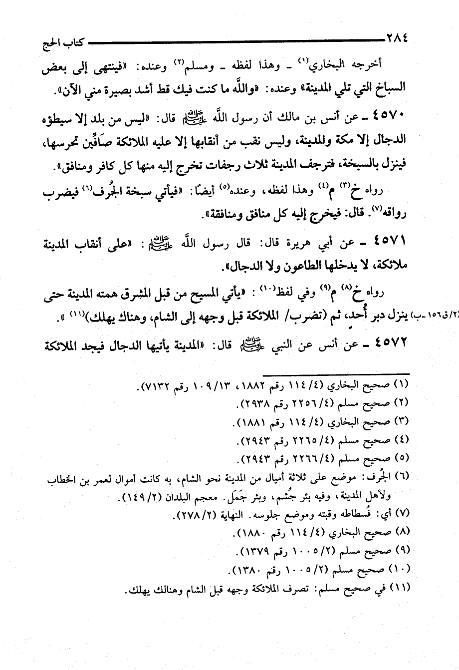 4570 - عن أنس بن مالك أن رسول الله - صلى الله عليه وسلم - قال: "ليس من بلد إلا سيطؤه الدجال إلا مكة والمدينة، وليس نقب من أنقابها إلا عليه الملائكة صَافِّين تحرسها، فينزل بالسبخة، فترجف المدينة ثلاث رجفات تخرج إليه منها كل كافر ومنافق".