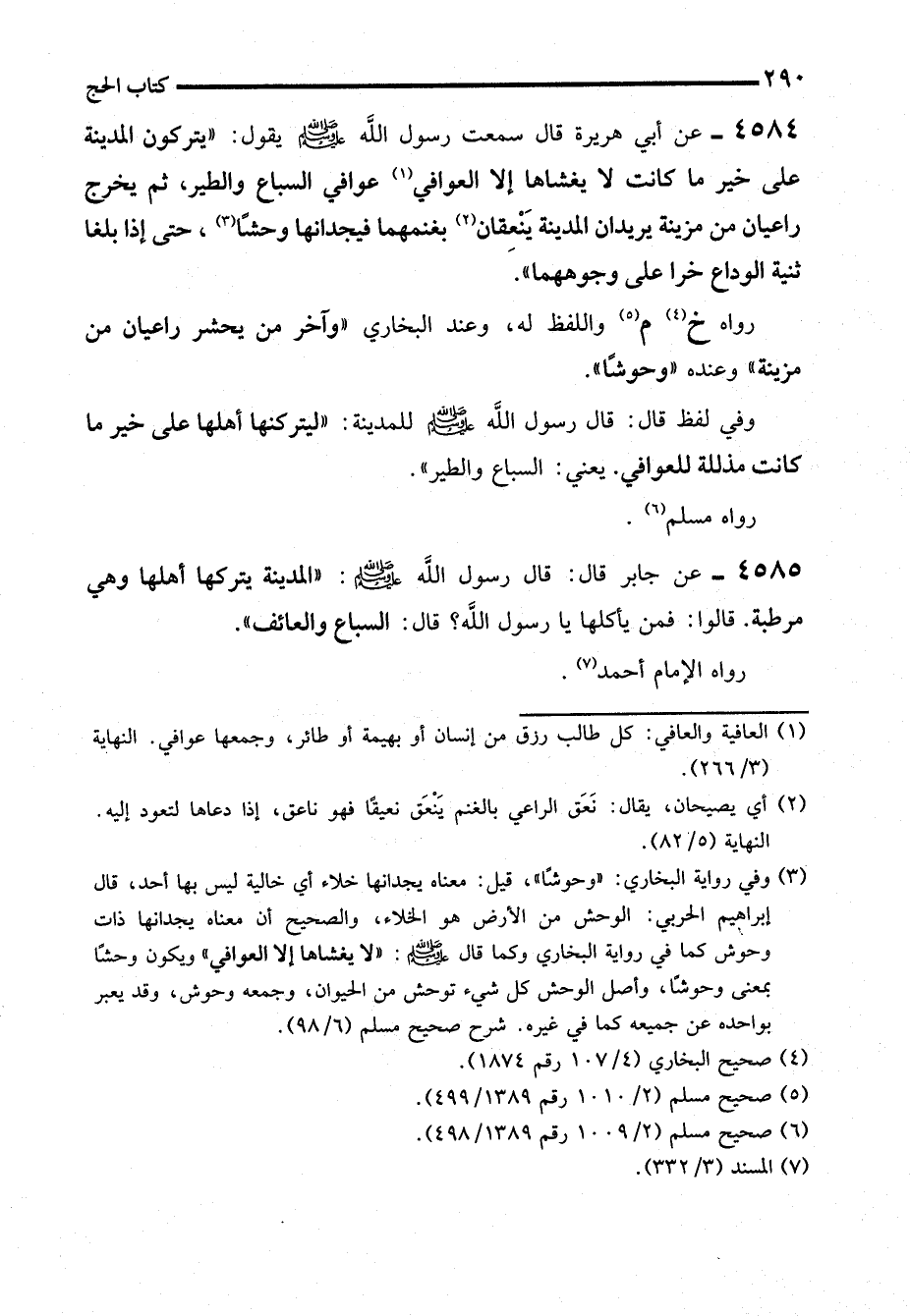4585 - عن جابر قال: قال رسول الله - صلى الله عليه وسلم -: "المدينة يتركها أهلها وهي مرطبة. قالوا: فمن يأكلها يا رسول الله؟ قال: السباع والعائف".