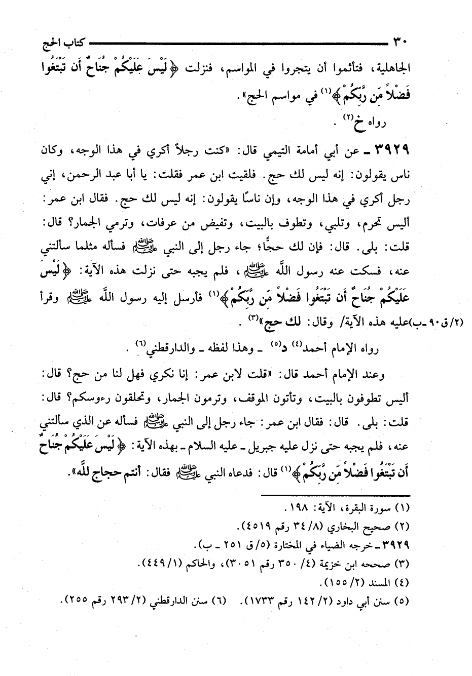 3929 - عن أبي أمامة التيمي قال: "كنت رجلاً أكري في هذا الوجه، وكان ناس يقولون: إنه ليس لك حج. فلقيت ابن عمر فقلت: يا أبا عبد الرحمن، إني رجل أكري في هذا الوجه، وإن ناسًا يقولون: إنه ليس لك حج. فقال ابن عمر: أليس تحرم، وتلبي، وتطوف بالبيت، وتفيض من عرفات، وترمي الجمار؟ قال: قلت: بلى. قال: فإن لك حجًّا؛ جاء رجل إلى النبي - صلى الله عليه وسلم - فسأله مثلما سألتني عنه، فسكت عنه رسول الله - صلى الله عليه وسلم -، فلم يجبه حتى نزلت هذه الآية: {لَيْسَ عَلَيْكُمْ جُنَاحٌ أَنْ تَبْتَغُوا فَضْلًا مِنْ رَبِّكُمْ} (1) فأرسل إليه رسول الله - صلى الله عليه وسلم - وقرأ عليه هذه الآية وقال: لك حج" (¬3).