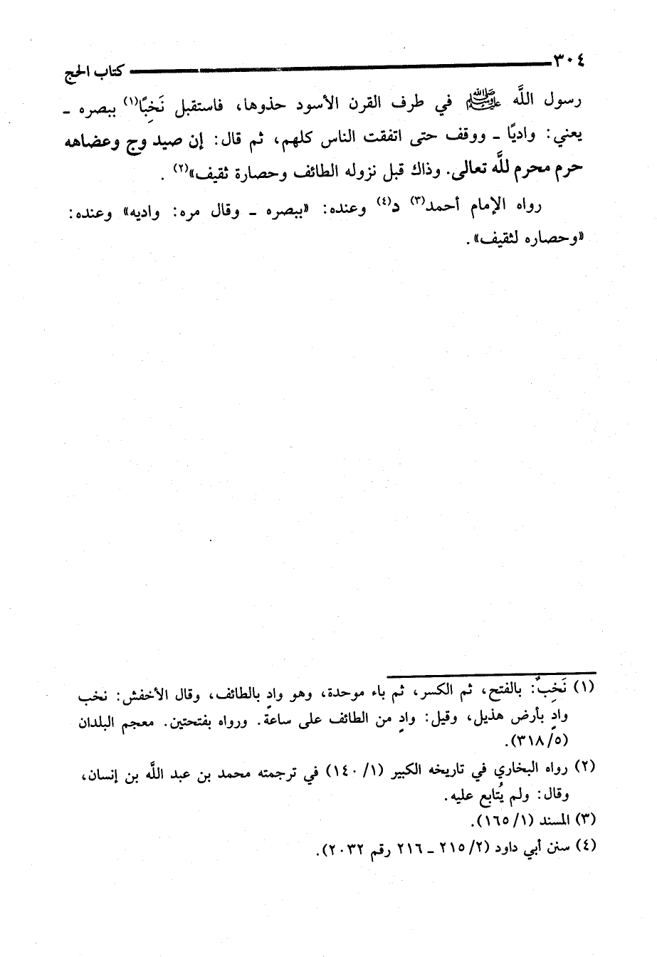 رسول الله - صلى الله عليه وسلم - في طرف القرن الأسود حذوها، فاستقبل نَخِبًا (¬1) ببصره -يعني: واديًا- ووقف حتى اتفقت الناس كلهم، ثم قال: إن صيد وج وعضاهه حرم محرم للَّه تعالى. وذاك قبل نزوله الطائف وحصارة ثقيف" (¬2).