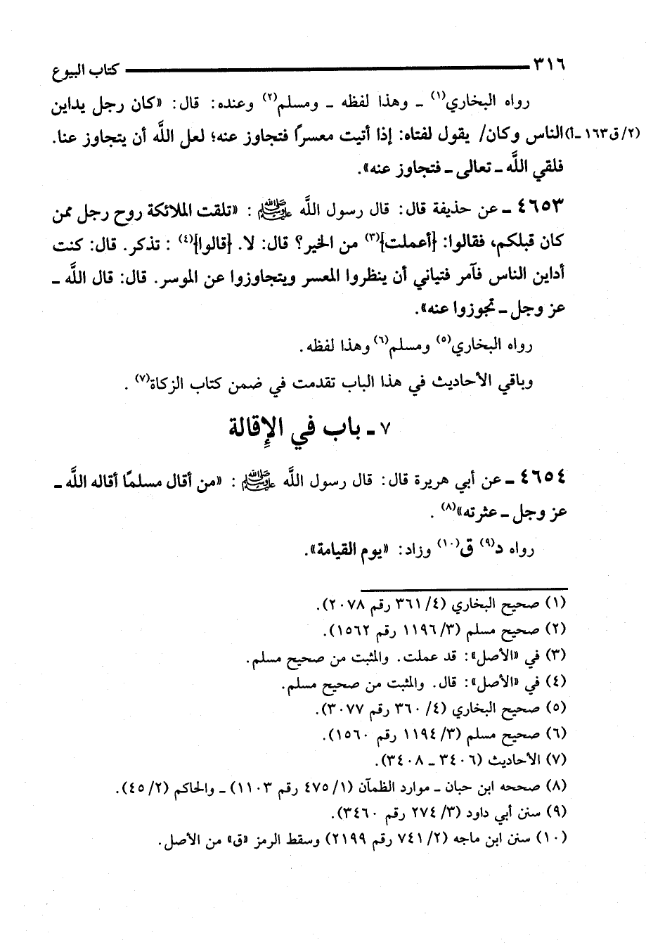4654 - عن أبي هريرة قال: قال رسول الله - صلى الله عليه وسلم - "من أقال مسلمًا أقاله الله -عز وجل- عثرته" (¬8).