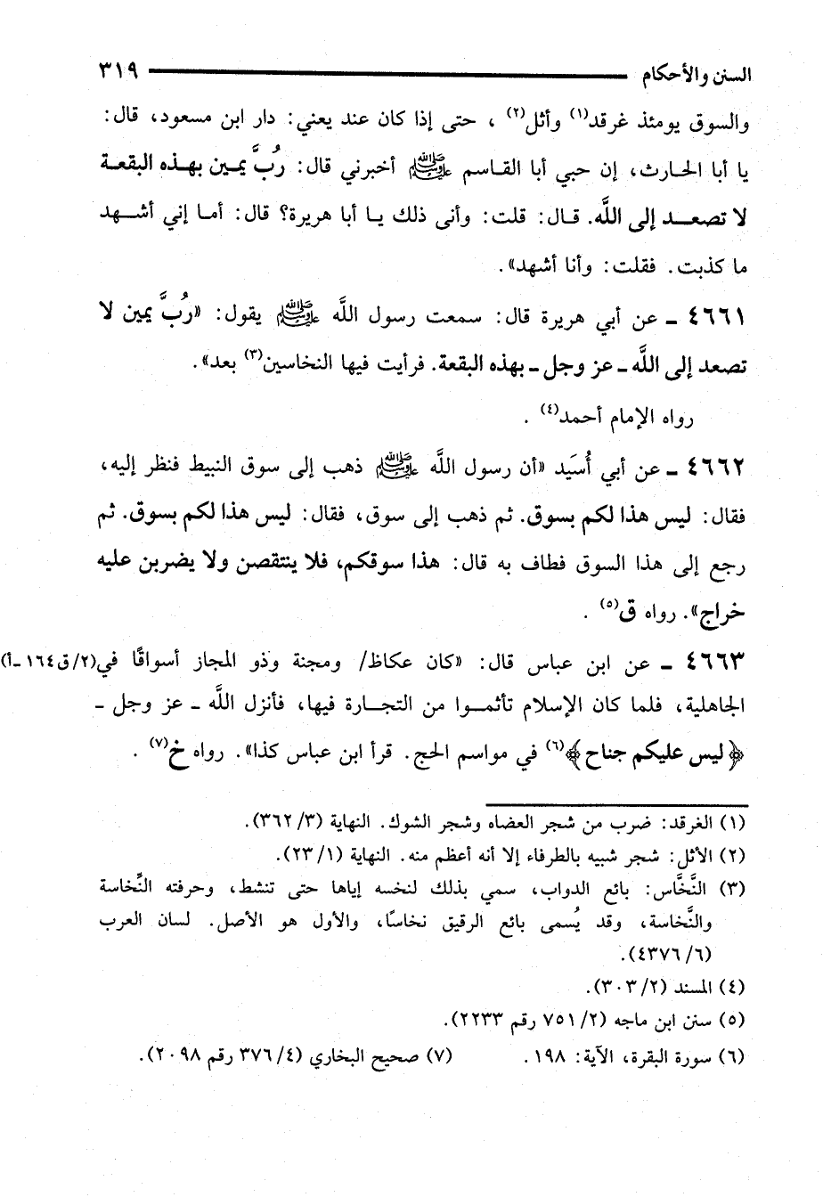 4662 - عن أبي أُسَيد "أن رسول الله - صلى الله عليه وسلم - ذهب إلى سوق النبيط فنظر إليه، فقال: ليس هذا لكم بسوق. ثم ذهب إلى سوق، فقال: ليس هذا لكم بسوق. ثم رجع إلى هذا السوق فطاف به قال: هذا سوقكم، فلا ينتقصن ولا يضربن عليه خراج". رواه ق (¬5).