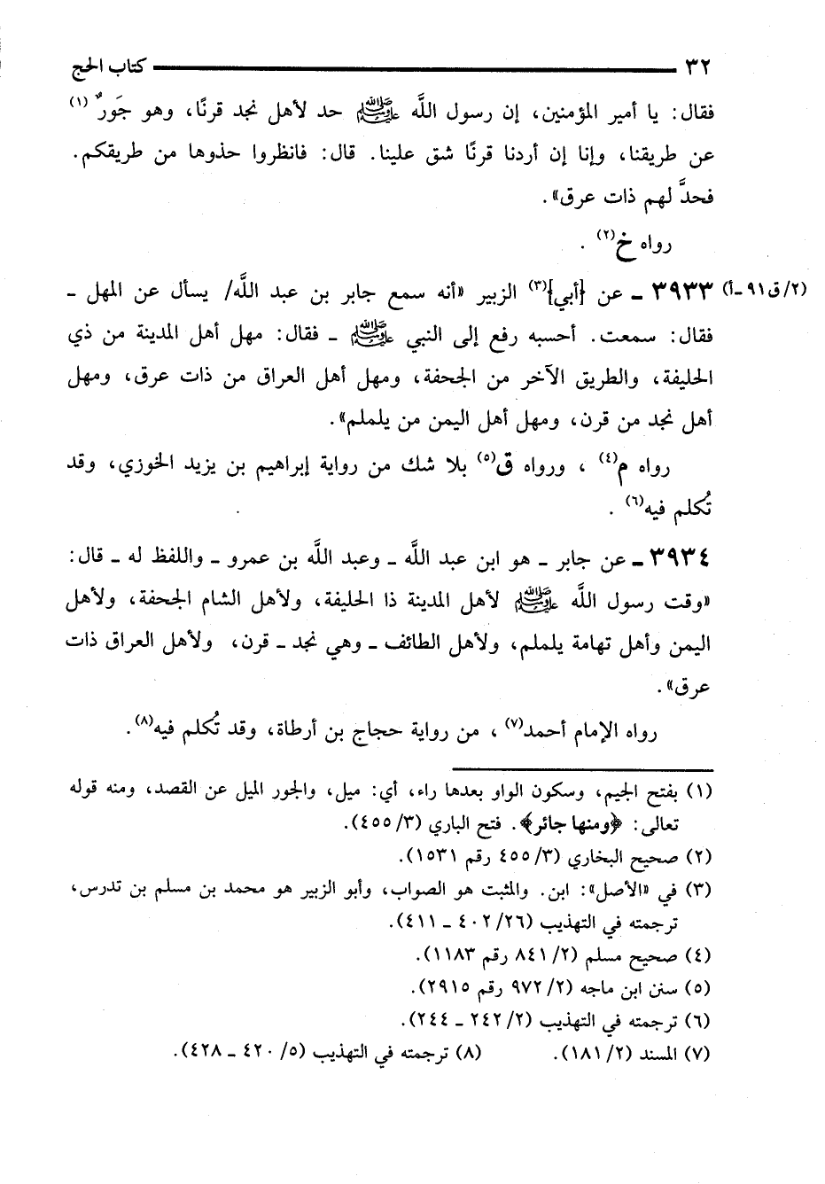 3934 - عن جابر -هو ابن عبد الله- وعبد الله بن عمرو -واللفظ له- قال: "وقت رسول الله - صلى الله عليه وسلم - لأهل المدينة ذا الحليفة، ولأهل الشام الجحفة، ولأهل اليمن وأهل تهامة يلملم، ولأهل الطائف -وهي نجد- قرن، ولأهل العراق ذات عرق".