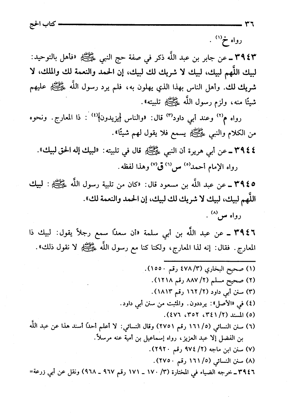 3943 - عن جابر بن عبد الله ذكر في صفة حج النبي - صلى الله عليه وسلم - "فأهل بالتوحيد: لبيك اللهم لبيك، لبيك لا شريك لك لبيك، إن الحمد والنعمة لك والملك، لا شريك لك. وأهل الناس بهذا الذي يهلون به، فلم يرد رسول الله - صلى الله عليه وسلم - عليهم شيئًا منه، ولزم رسول الله - صلى الله عليه وسلم - تلبيته".