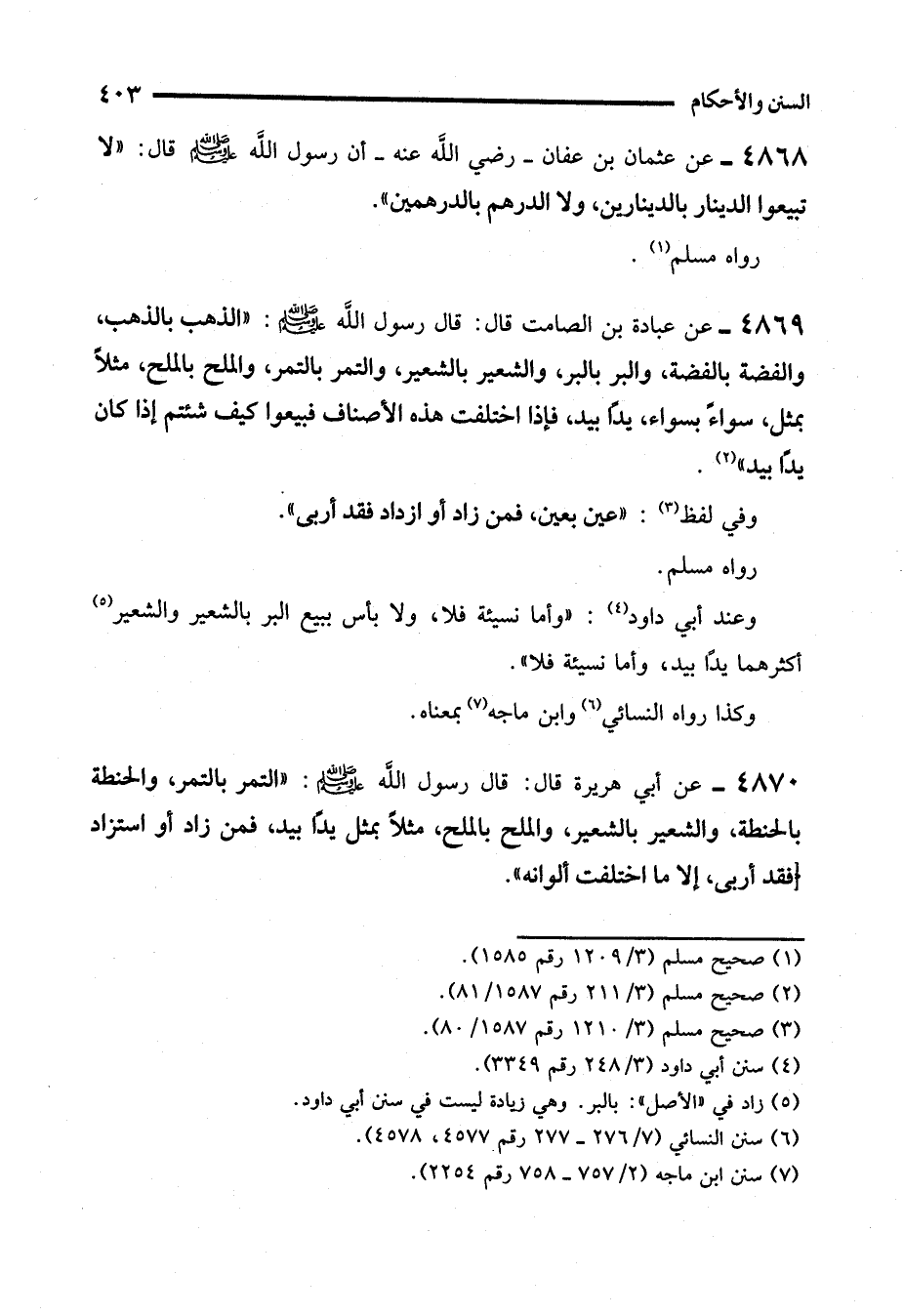 4869 - عن عبادة بن الصامت قال: قال رسول الله - صلى الله عليه وسلم -: "الذهب بالذهب، والفضة بالفضة، والبر بالبر، والشعير بالشعير، والتمر بالتمر، والملح بالملح، مثلاً بمثل، سواءً بسواء، يداً بيد، فإذا اختلفت هذه الأصناف فبيعوا كيف شئتم إذا كان يدًا بيد" (¬2).