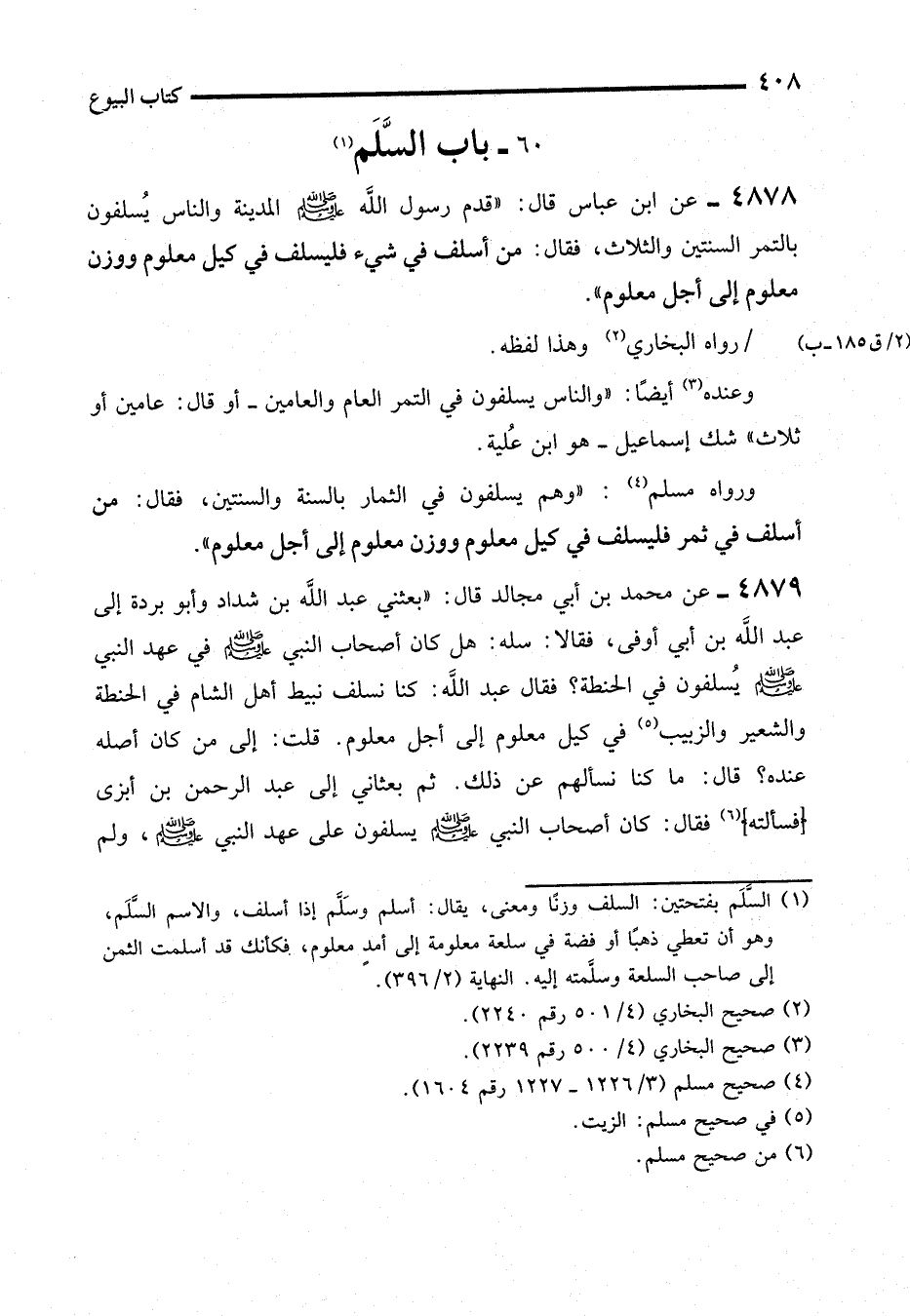 4878 - عن ابن عباس قال: "قدم رسول الله - صلى الله عليه وسلم - المدينة والناس يُسلفون بالتمر السنتين والثلاث، فقال: من أسلف في شيء فليسلف في كيل معلوم ووزن معلوم إلى أجل معلوم".