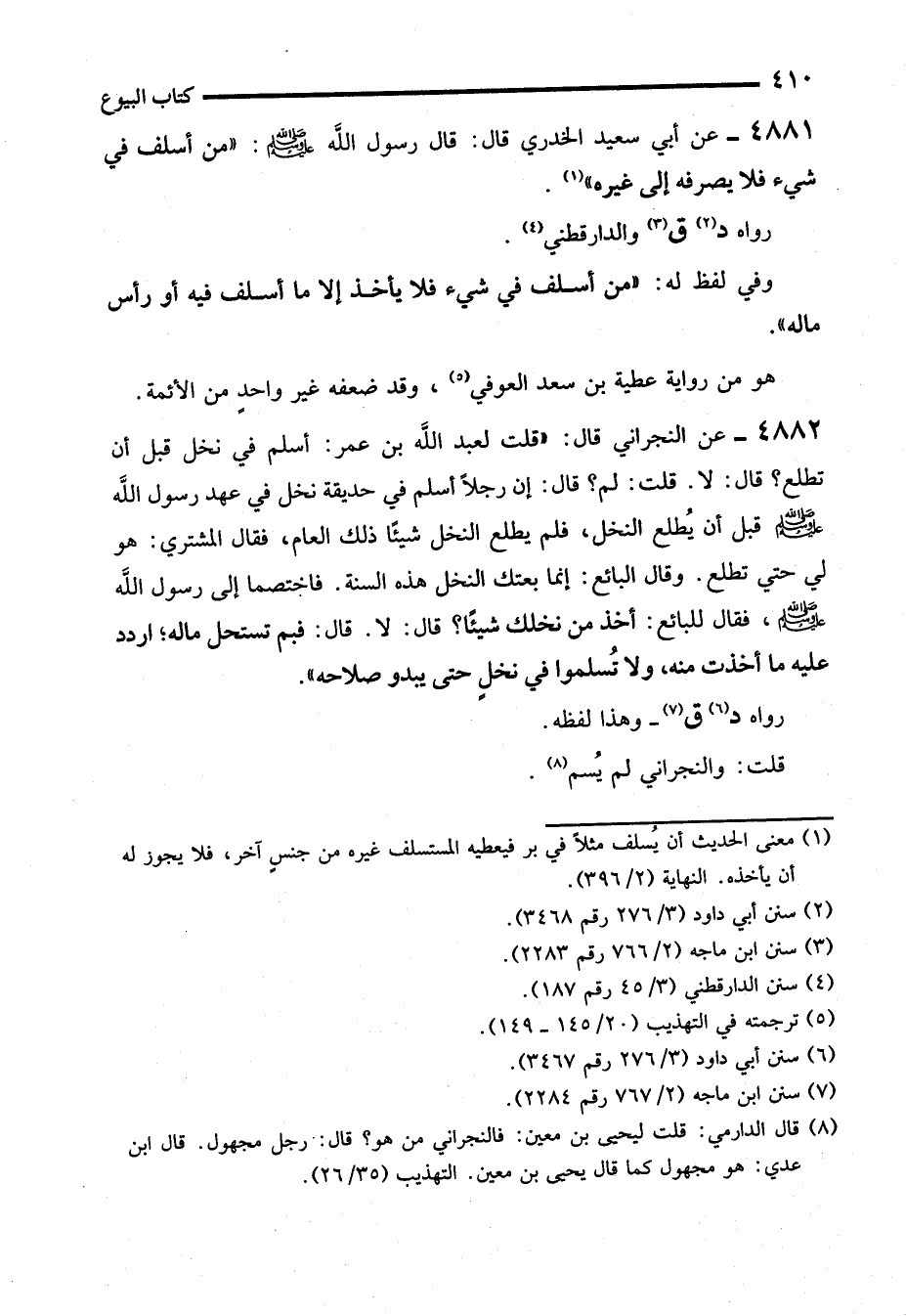 4882 - عن النجراني قال: "قلت لعبد الله بن عمر: أسلم في نخل قبل أن تطلع؟ قال: لا. قلت: لم؟ قال: إن رجلاً أسلم في حديقة نخل في عهد رسول الله - صلى الله عليه وسلم - قبل أن يُطلع النخل، فلم يطلع النخل شيئاً ذلك العام، فقال المشتري: هو لي حتى تطلع. وقال البائع: إنما بعتك النخل هذه السنة. فاختصما إلى رسول الله - صلى الله عليه وسلم -، فقال للبائع: أخذ من نخلك شيئًا؟ قال: لا. قال: فبم تستحل ماله؛ اردد عليه ما أخذت منه، ولا تُسلموا في نخلٍ حتى يبدو صلاحه".