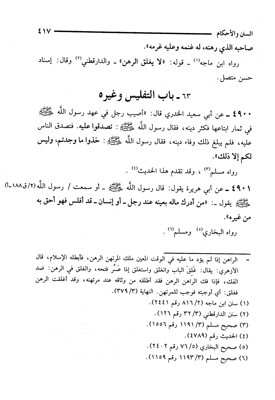 4900 - عن أبي سعيد الخدري قال: "أصيب رجل في عهد رسول الله - صلى الله عليه وسلم - في ثمار ابتاعها فكثر دينه، فقال رسول الله - صلى الله عليه وسلم - تصدقوا عليه. فتصدق الناس عليه، فلم يبلغ ذلك وفاء دينه، فقال رسول الله - صلى الله عليه وسلم - خذوا مما وجدتم، وليس لكم إلا ذلك".