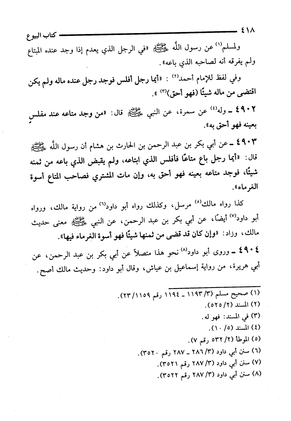4903 - عن أبي بكر بن عبد الرحمن بن الحارث بن هشام أن رسول الله - صلى الله عليه وسلم - قال: "أيما رجل باع متاعًا فأفلس الذي ابتاعه، ولم يقبض الذي باعه من ثمنه شيئًا، فوجد متاعه بعينه فهو أحق به، وإن مات المشتري فصاحب المتاع أسوة الغرماء".