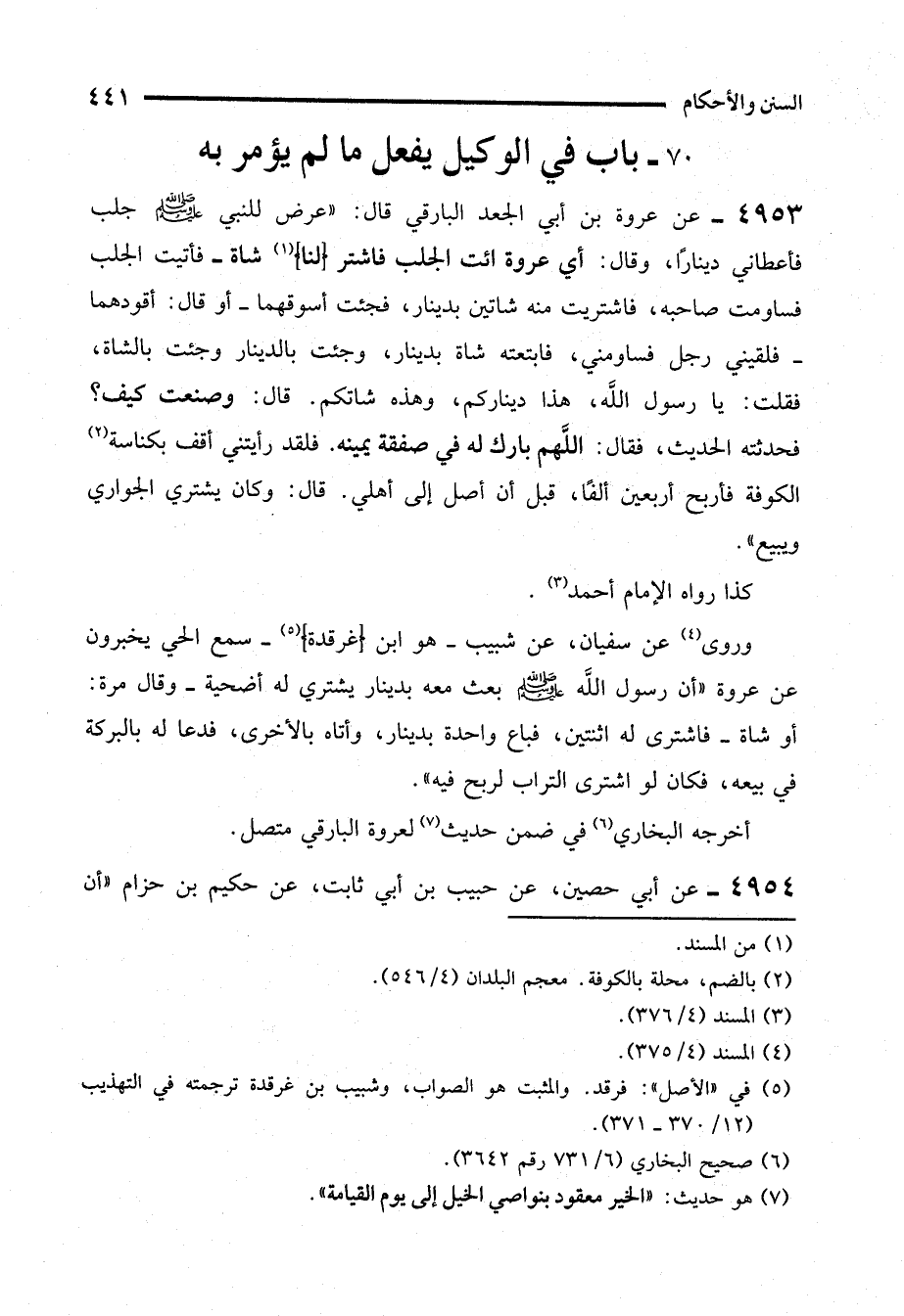 4953 - عن عروة بن أبي الجعد البارقي قال: "عرض للنبي - صلى الله عليه وسلم - جلب فأعطاني دينارًا، وقال: أي عروة ائت الجلب فاشتر (لنا) (¬1) شاة -فأتيت الجلب فساومت صاحبه، فاشتريت منه شاتين بدينار، فجئت أسوقهما -أو قال: أقودهما- فلقيني رجل فساومني، فابتعته شاة بدينار، وجئت بالدينار وجئت بالشاة، فقلت: يا رسول الله، هذا ديناركم، وهذه شاتكم. قال: وصنعت كيف؟ فحدثته الحديث، فقال: اللَّهم بارك له في صفقة يمينه. فلقد رأيتني أقف بكناسة (¬2) الكوفة فأربح أربعين ألفًا، قبل أن أصل إلى أهلي. قال: وكان يشتري الجواري ويبيع".