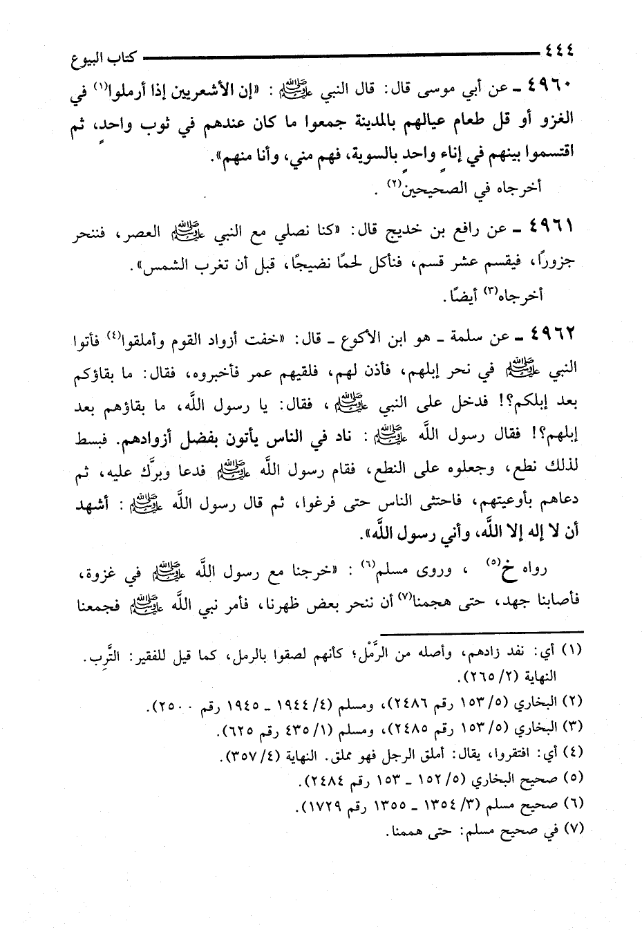 4961 - عن رافع بن خديج قال: "كنا نصلي مع النبي - صلى الله عليه وسلم - العصر، فننحر جزوراً، فيقسم عشر قسم، فنأكل لحمًا نضيجًا، قبل أن تغرب الشمس".