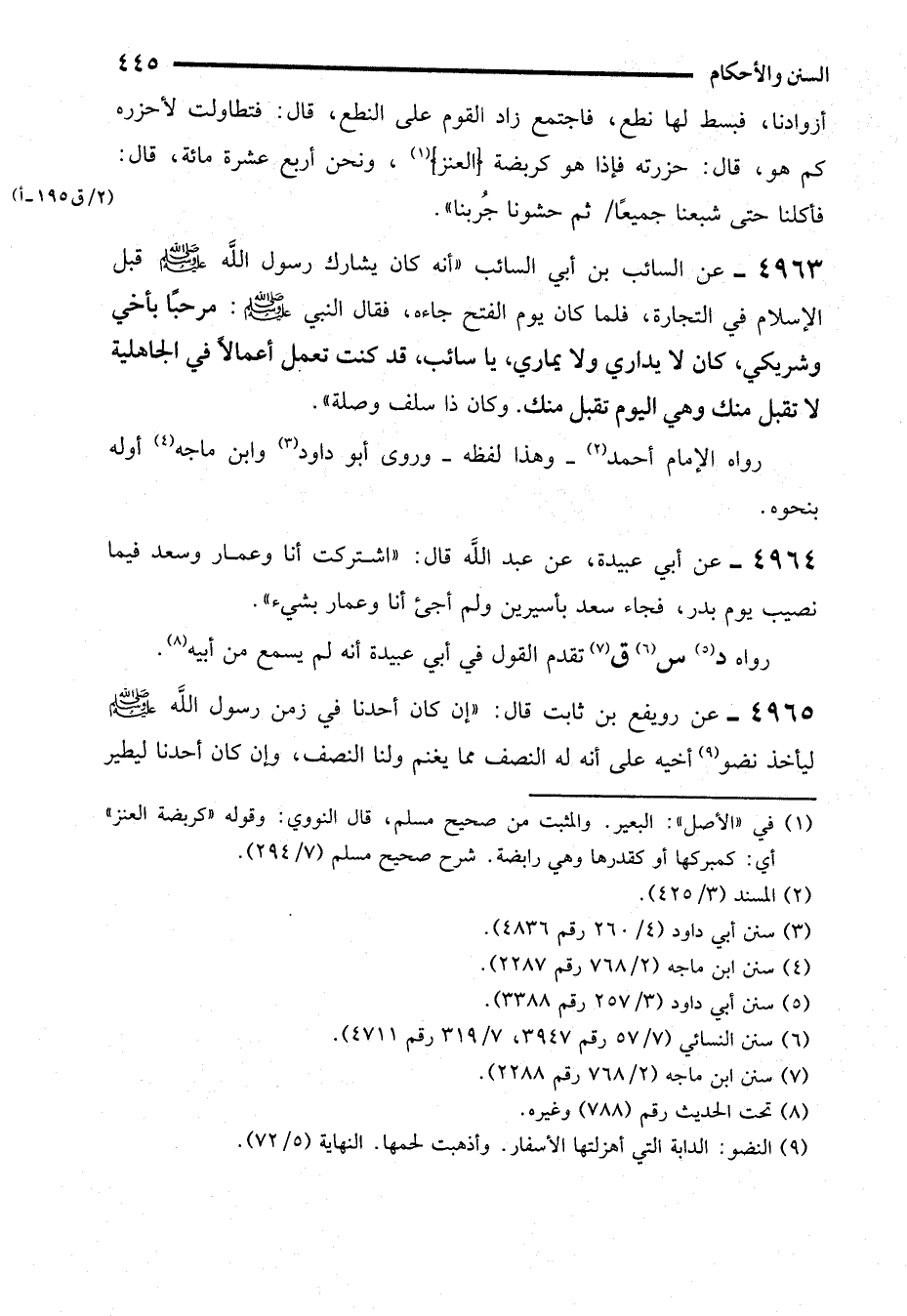 4963 - عن السائب بن أبي السائب "أنه كان يشارك رسول الله - صلى الله عليه وسلم - قبل الإسلام في التجارة، فلما كان يوم الفتح جاءه، فقال النبي - صلى الله عليه وسلم -: مرحبًا بأخي وشريكي، كان لا يداري ولا يماري، يا سائب، قد كنت تعمل أعمالاً في الجاهلية لا تقبل منك وهي اليوم تقبل منك. وكان ذا سلف وصلة".