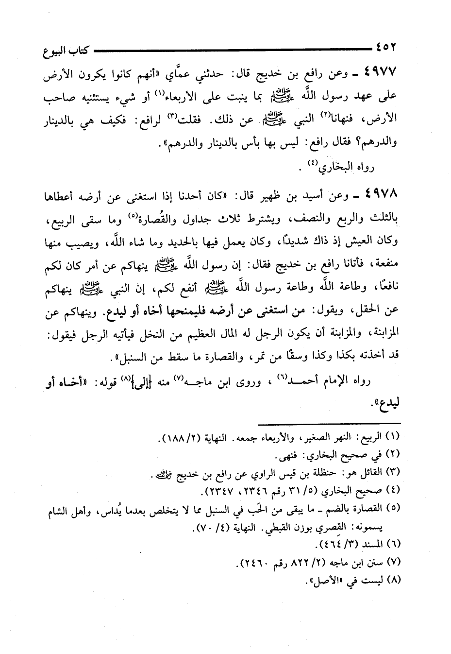 4978 - وعن أسيد بن ظهير قال: "كان أحدنا إذا استغنى عن أرضه أعطاها بالثلث والربع والنصف، ويشترط ثلاث جداول والقُصارة (¬5) وما سقى الربيع، وكان العيش إذ ذاك شديدًا، وكان يعمل فيها بالحديد وما شاء الله، ويصيب منها منفعة، فأتانا رافع بن خديج فقال: إن رسول الله - صلى الله عليه وسلم - ينهاكم عن أمر كان لكم نافعًا، وطاعة الله وطاعة رسول الله - صلى الله عليه وسلم - أنفع لكم، إن النبي - صلى الله عليه وسلم - ينهاكم عن الحقل، ويقول: من استغنى عن أرضه فليمنحها أخاه أو ليدع. وينهاكم عن المزابنة، والمزابنة أن يكون الرجل له المال العظيم من النخل فيأتيه الرجل فيقول: قد أخذته بكذا وكذا وسقًا من تمر، والقصارة ما سقط من السنبل".
