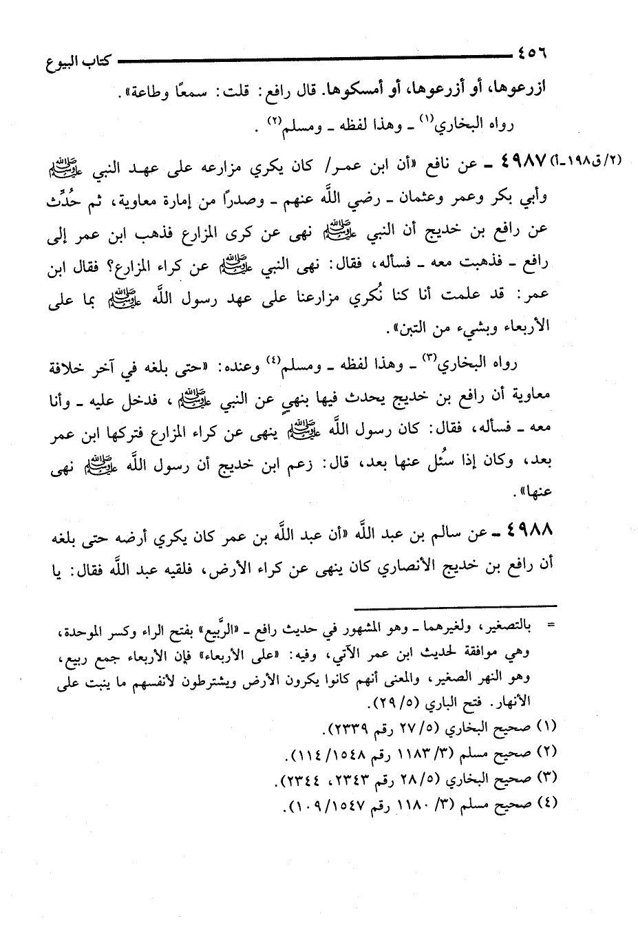 4987 - عن نافع "أن ابن عمر كان يكري مزارعه على عهد النبي - صلى الله عليه وسلم - وأبي بكر وعمر وعثمان -رضي الله عنهم- وصدرًا من إمارة معاوية، ثم حُدِّث عن رافع بن خديج أن النبي - صلى الله عليه وسلم - نهى عن كرى المزارع فذهب ابن عمر إلى رافع -فذهبت معه- فسأله، فقال: نهى النبي - صلى الله عليه وسلم - عن كراء المزارع؟ فقال ابن عمر: قد علمت أنا كنا نُكري مزارعنا على عهد رسول الله - صلى الله عليه وسلم - بما على الأربعاء وبشيء من التبن".