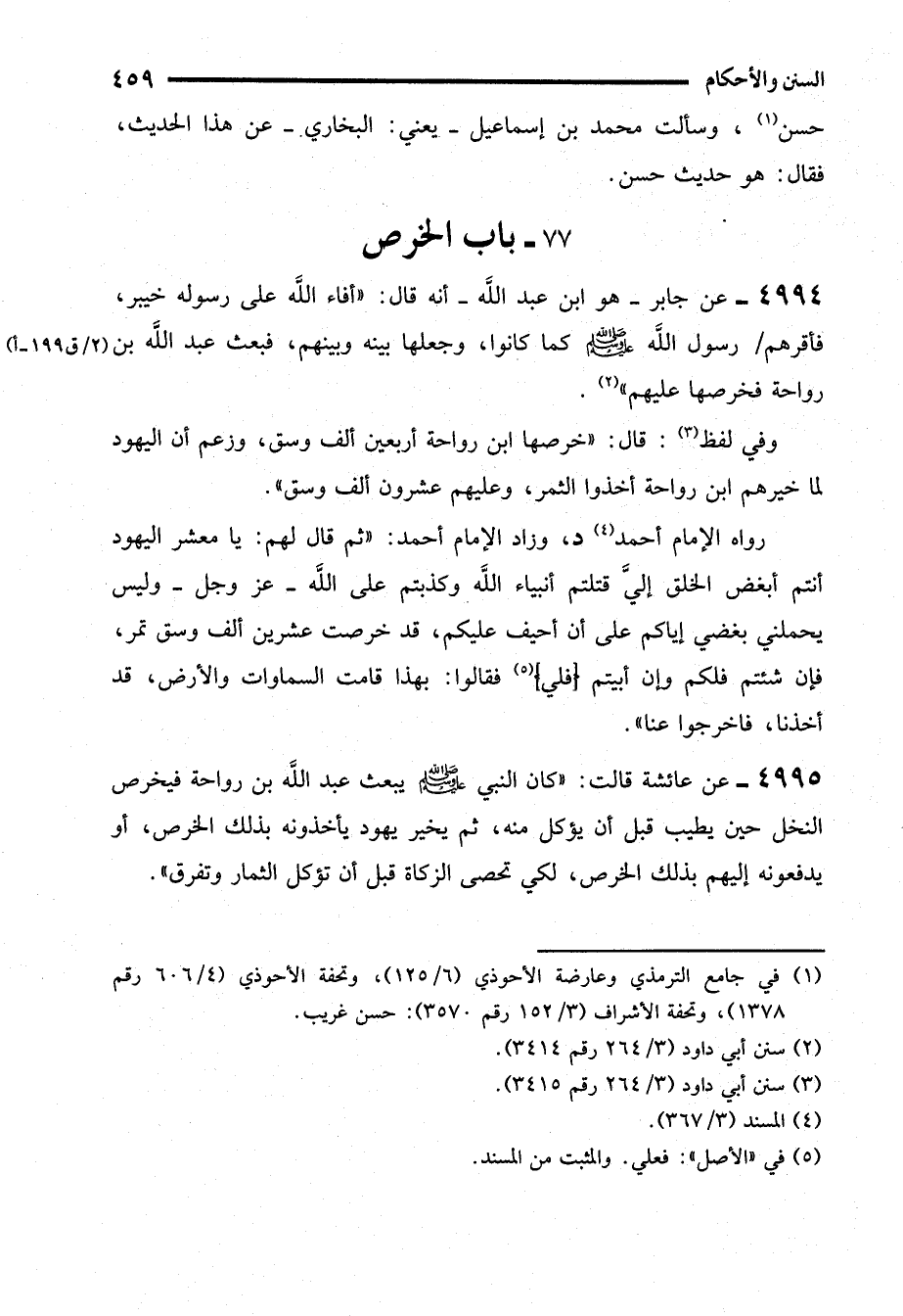 4995 - عن عائشة قالت: "كان النبي - صلى الله عليه وسلم - يبعث عبد الله بن رواحة فيخرص النخل حين يطيب قبل أن يؤكل منه، ثم يخير يهود يأخذونه بذلك الخرص، أو يدفعونه إليهم بذلك الخرص، لكي تحصى الزكاة قبل أن تؤكل الثمار وتفرق".