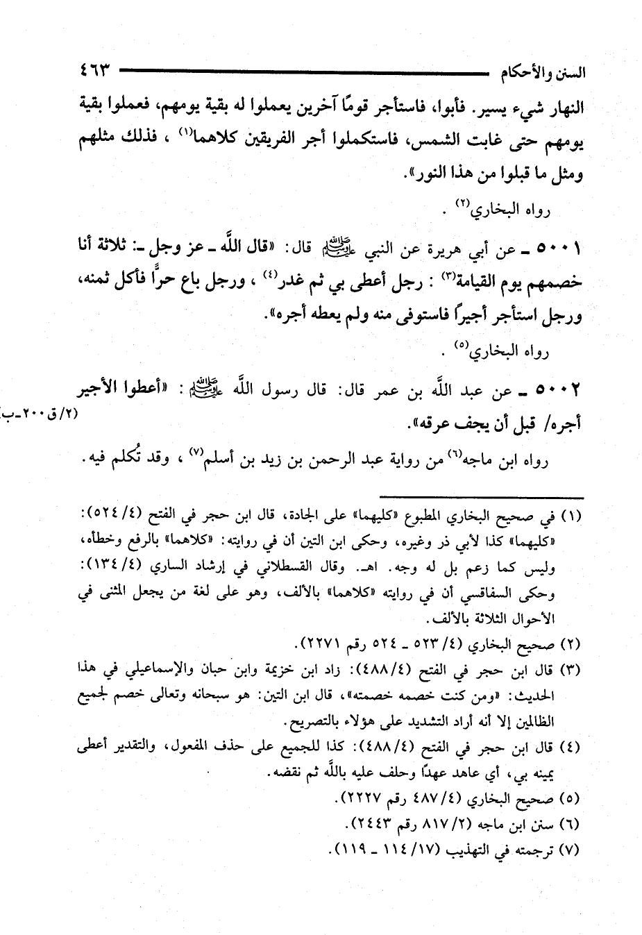 5001 - عن أبي هريرة عن النبي - صلى الله عليه وسلم - قال: "قال الله -عز وجل-: ثلاثه أنا خصمهم يوم القيامة (¬3): رجل أعطى بي ثم غدر (¬4)، ورجل باع حرًّا فأكل ثمنه، ورجل استأجر أجيرًا فاستوفى منه ولم يعطه أجره".