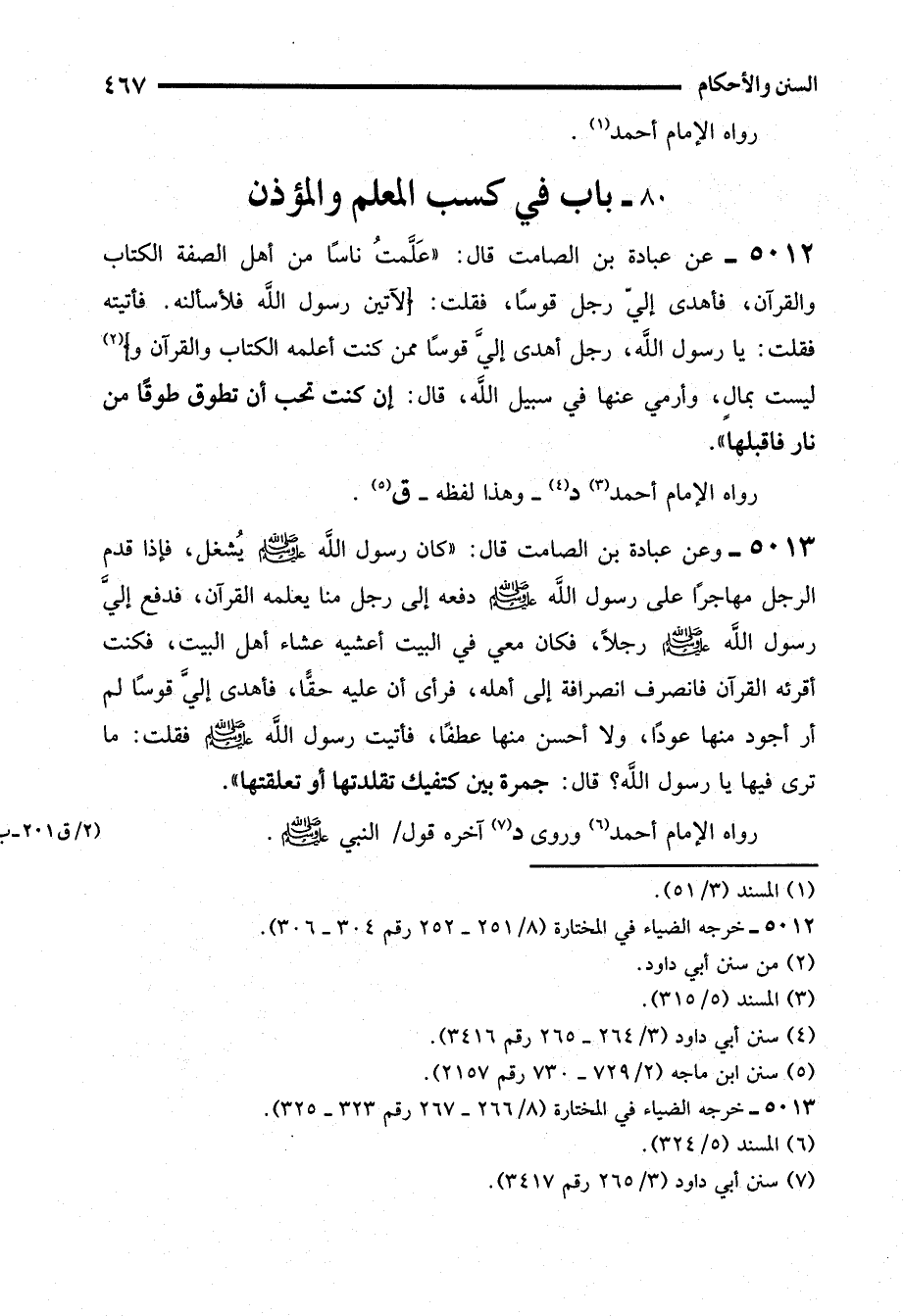 5012 - عن عبادة بن الصامت قال: "عَلَّمتُ ناسًا من أهل الصفة الكتاب والقرآن، فأهدى إليّ رجل قوسًا، فقلت: (لآتين رسول الله فلأسألنه. فأتيته فقلت: يا رسول الله، رجل أهدى إليَّ قوسًا ممن كنت أعلمه الكتاب والقرآن و) (¬2) ليست بمالٍ، وأرمي عنها في سبيل الله، قال: إن كنت تحب أن تطوق طوقًا من نار فاقبلها".