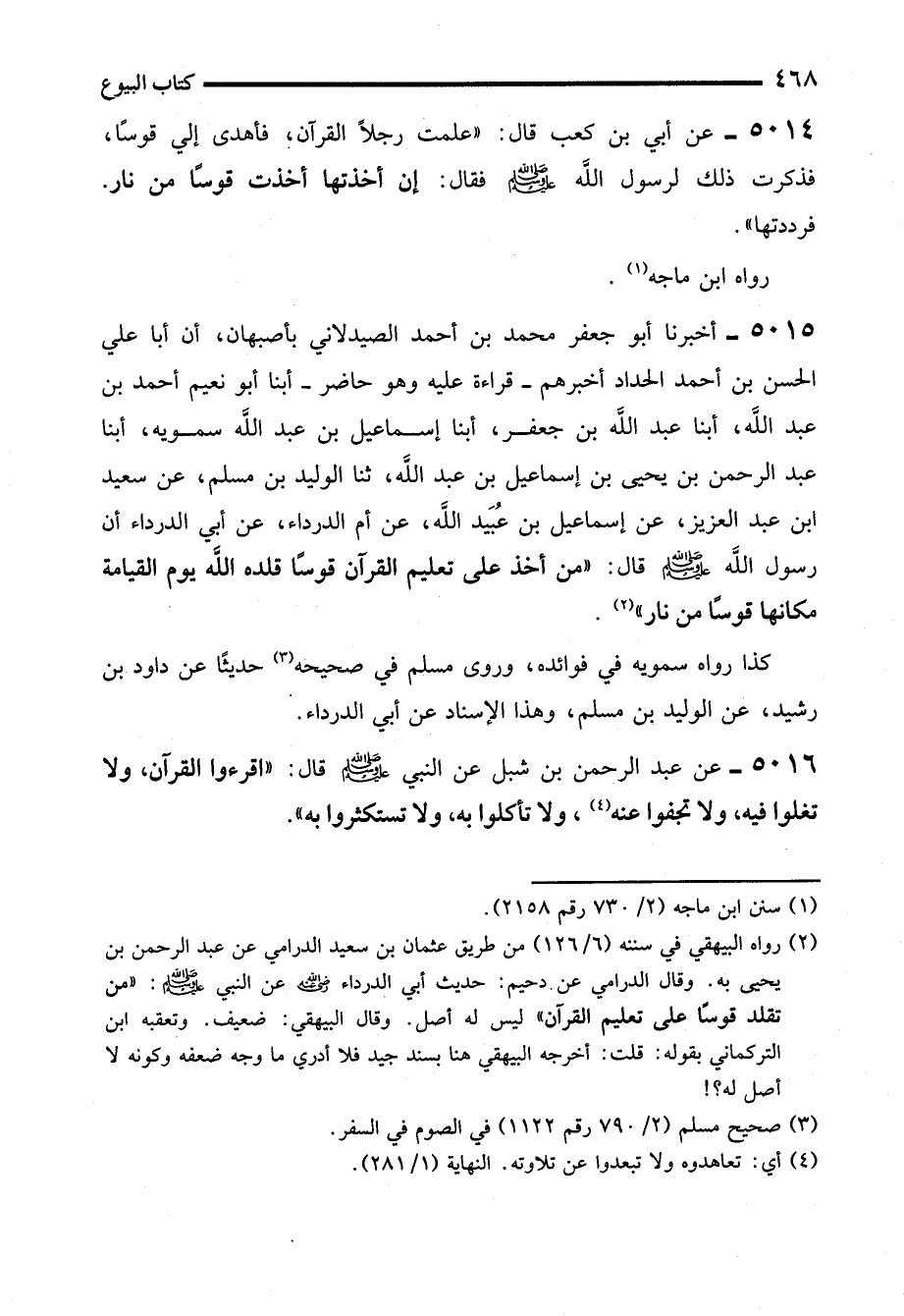 5014 - عن أبي بن كعب قال: "علمت رجلاً القرآن، فأهدى إلي قوسًا، فذكرت ذلك لرسول الله - صلى الله عليه وسلم - فقال: إن أخذتها أخذت قوسًا من نار. فرددتها".