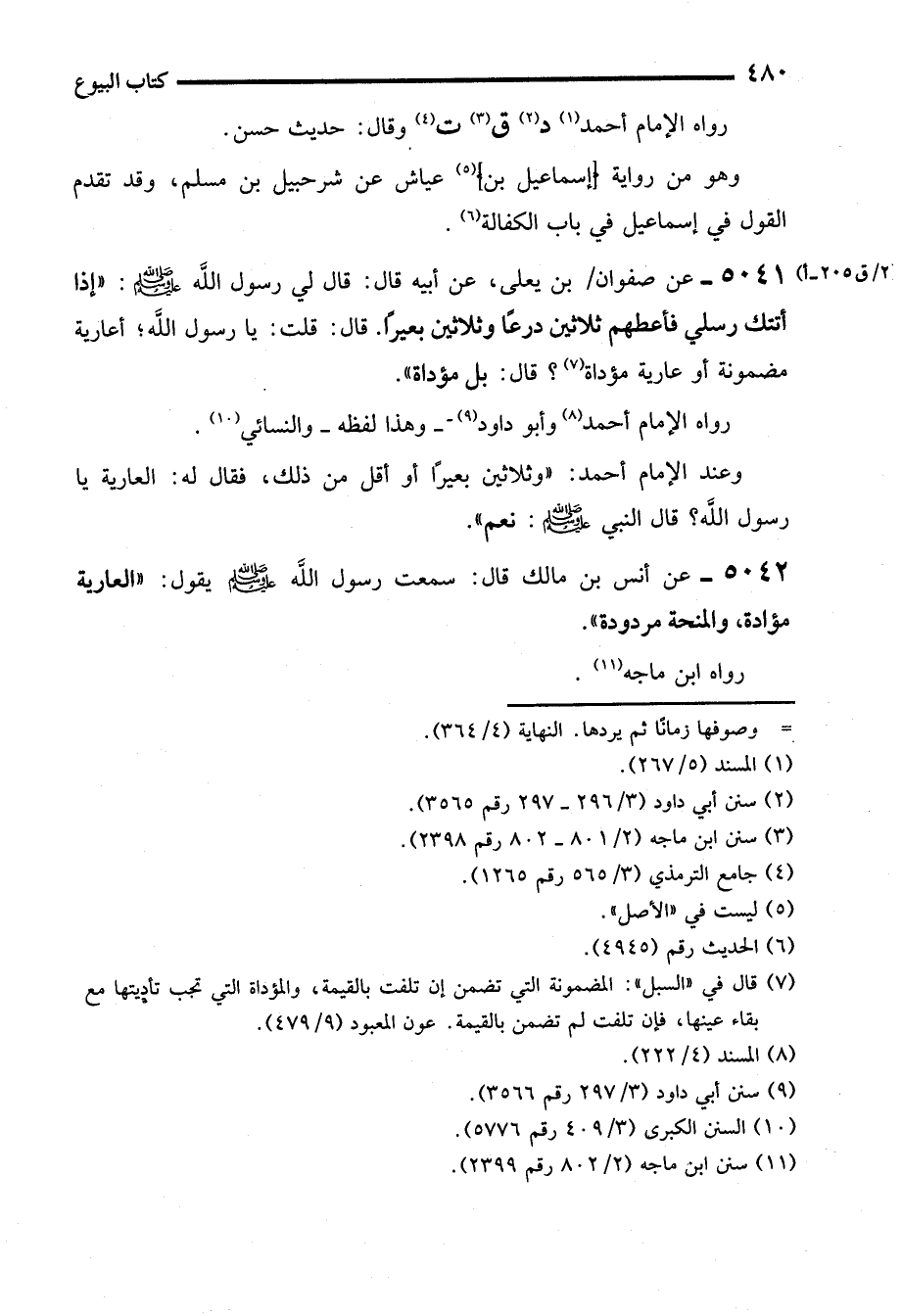 5041 - عن صفوان بن يعلى، عن أبيه قال: قال لي رسول الله - صلى الله عليه وسلم -: "إذا أتتك رسلي فأعطهم ثلاثين درعًا وثلاثين بعيرًا. قال: قلت: يا رسول الله؛ أعارية مضمونة أو عارية مؤداة (¬7)؟ قال: بل مؤداة".