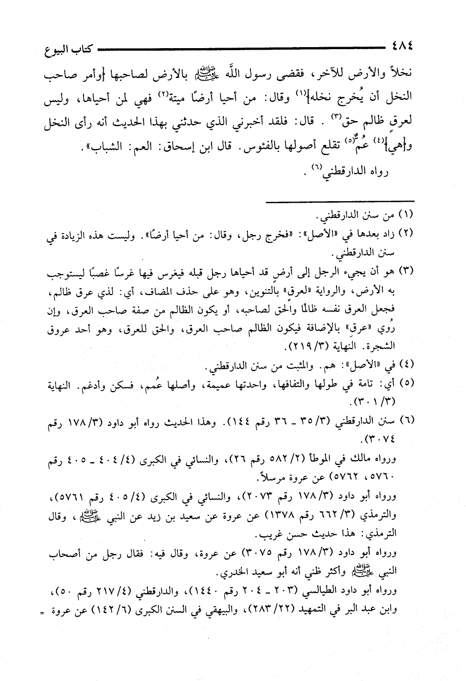 (¬3) هو أن يجيء الرجل إلى أرضٍ قد أحياها رجل قبله فيغرس فيها غرسًا غصبًا ليستوجب به الأرض، والرواية "لعرقٍ" بالتنوين، وهو على حذف المضاف، أي: لذي عرق ظالم، فجعل العرق نفسه ظالمًا والحق لصاحبه، أو يكون الظالم من صفة صاحب العرق، وإن رُوي "عرقِ" بالإضافة فيكون الظالم صاحب العرق، والحق للعرق، وهو أحد عروق الشجرة. النهاية (3/ 219).
