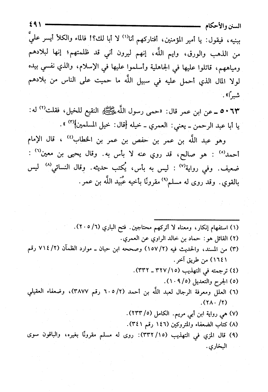 5063 - عن ابن عمر قال: "حمى رسول الله - صلى الله عليه وسلم - النقيع للخيل، فقلت (¬2) له: يا أبا عبد الرحمن -يعني: العمري- خيله (قال: خيل المسلمين) (¬3) ".