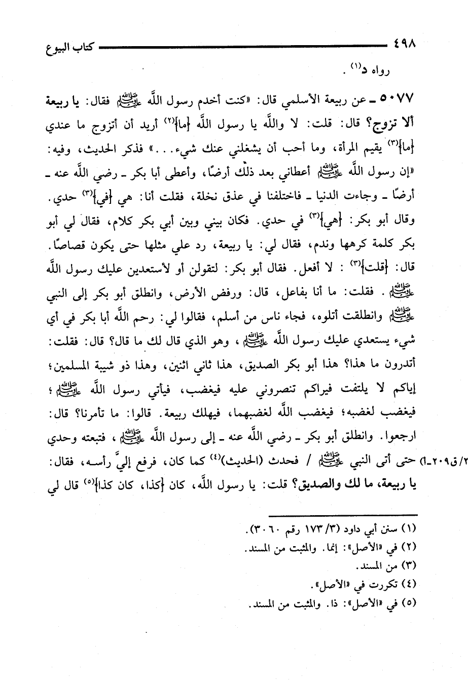 5077 - عن ربيعة الأسلمي قال: "كنت أخدم رسول الله - صلى الله عليه وسلم -، فقال: يا ربيعة ألا تزوج؟ قال: قلت: لا واللَّه يا رسول الله (ما) (¬2) أريد أن أتزوج ما عندي (ما) (¬3) يقيم المرأة، وما أحب أن يشغلني عنك شيء ... " فذكر الحديث، وفيه: "إن رسول الله - صلى الله عليه وسلم - أعطاني بعد ذلك أرضًا، وأعطى أبا بكر -رضي الله عنه- أرضًا -وجاءت الدنيا- فاختلفنا في عذق نخلة، فقلت أنا: هي (في) (3) حدي. وقال أبو بكر: (هي) (3) في حدي. فكان بيني وبين أبي بكر كلام، فقال لي أبو بكر كلمة كرهها وندم، فقال لي: يا ربيعة، رد علي مثلها حتى يكون قصاصًا. قال: (قلت) (3): لا أفعل. فقال أبو بكر: لتقولن أو لأستعدين عليك رسول الله - صلى الله عليه وسلم - فقلت: ما أنا بفاعل، قال: ورفض الأرض، وانطلق أبو بكر إلى النبي - صلى الله عليه وسلم - وانطلقت أتلوه، فجاء ناس من أسلم، فقالوا لي: رحم الله أبا بكر في أي شيء يستعدي عليك رسول الله - صلى الله عليه وسلم -، وهو الذي قال لك ما قال؟ قال: فقلت: أتدرون ما هذا؟ هذا أبو بكر الصديق، هذا ثاني اثنين، وهذا ذو شيبة المسلمين؛ إياكم لا يلتفت فيراكم تنصروني عليه فيغضب، فيأتي رسول الله - صلى الله عليه وسلم -؛ فيغضب لغضبه؛ فيغضب الله لغضبهما، فيهلك ربيعة. قالوا: ما تأمرنا؟ قال: ارجعوا. وانطلق أبو بكر -رضي الله عنه- إلى رسول الله - صلى الله عليه وسلم -، فتبعته وحدي حتى أتى النبي - صلى الله عليه وسلم - فحدث (الحديث) (¬4) كما كان، فرفع إليَّ رأسه، فقال: يا ربيعة، ما لك والصديق؟ قلت: يا رسول الله، كان (كذا، كان كذا) (¬5) قال لي