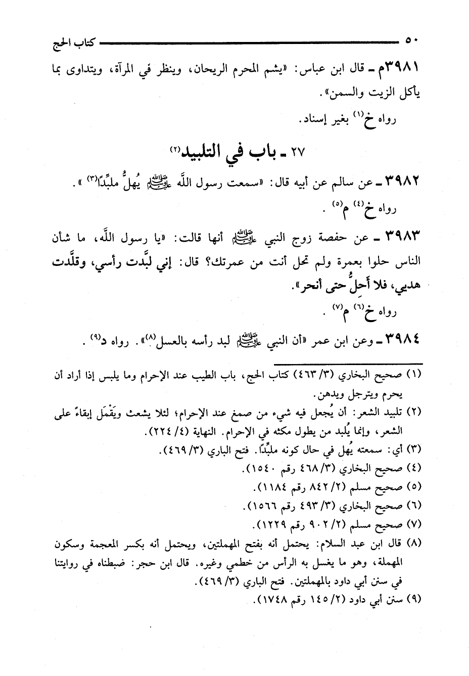 3981م- قال ابن عباس: "يشم المحرم الريحان، وينظر في المرآة، ويتداوى بما يأكل الزيت والسمن".