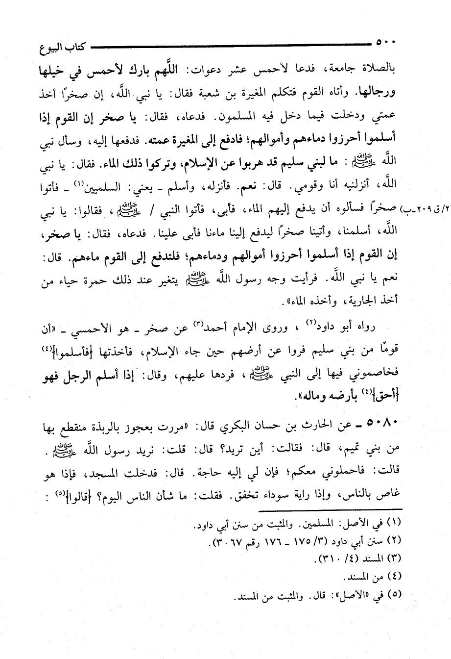 بالصلاة جامعة، فدعا لأحمس عشر دعوات: اللَّهم بارك لأحمس في خيلها ورجالها. وأتاه القوم فتكلم المغيرة بن شعبة فقال: يا نبي. الله، إن صخرًا أخذ عمتي ودخلت فيما دخل فيه المسلمون. فدعاه، فقال: يا صخر إن القوم إذا أسلموا أحرزوا دماءهم وأموالهم؛ فادفع إلى المغيرة عمته. فدفعها إليه، وسأل نبي الله - صلى الله عليه وسلم -: ما لبني سليم قد هربوا عن الإسلام، وتركوا ذلك الماء. فقال: يا نبي الله، أنزلنيه أنا وقومي. قال: نعم. فأنزله، وأسلم -يعني: السلميين (¬1) - فأتوا صخرًا فسألوه أن يدفع إليهم الماء، فأبى، فأتوا النبي - صلى الله عليه وسلم -، فقالوا: يا نبي الله، أسلمنا، وأتينا صخرًا ليدفع إلينا ماءنا فأبى علينا. فدعاه، فقال: يا صخر، إن القوم إذا أسلموا أحرزوا أموالهم ودماءهم؛ فلتدفع إلى القوم ماءهم. قال: نعم يا نبي الله. فرأيت وجه رسول الله - صلى الله عليه وسلم - يتغير عند ذلك حمرة حياء من أخذ الجارية، وأخذه الماء".
