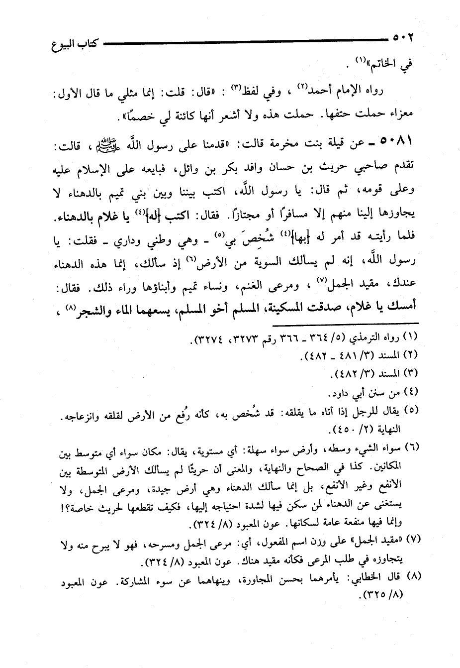 5081 - عن قيلة بنت مخرمة قالت: "قدمنا على رسول الله - صلى الله عليه وسلم -، قالت: تقدم صاحبي حريث بن حسان وافد بكر بن وائل، فبايعه على الإسلام عليه وعلى قومه، ثم قال: يا رسول الله، اكتب بيننا وبين بني تميم بالدهناء لا يجاوزها إلينا منهم إلا مسافراً أو مجتازًا. فقال: اكتب (له) (4) يا غلام بالدهناء. فلما رأيته قد أمر له (بها) (¬4) شُخِصَ بي (¬5) -وهي وطني وداري- فقلت: يا رسول الله، إنه لم يسألك السوية من الأرض (¬6) إذ سألك، إنما هذه الدهناء عندك، مقيد الجمل (¬7)، ومرعى الغنم، ونساء تميم وأبناؤها وراء ذلك. فقال: أمسك يا غلام، صدقت المسكينة، المسلم أخو المسلم، يسعهما الماء والشجر (¬8)،