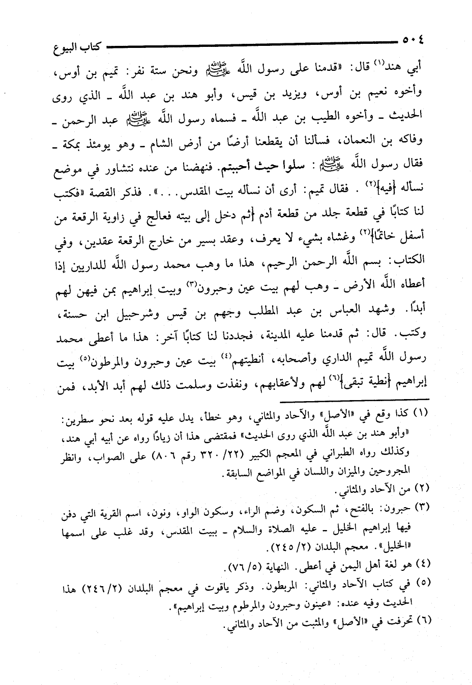 أبي هند (¬1) قال: "قدمنا على رسول الله - صلى الله عليه وسلم - ونحن ستة نفر: تميم بن أوس، وأخوه نعيم بن أوس، ويزيد بن قيس، وأبو هند بن عبد الله -الذي روى الحديث- وأخوه الطيب بن عبد الله -فسماه رسول الله - صلى الله عليه وسلم - عبد الرحمن- وفاكه بن النعمان، فسألنا أن يقطعنا أرضًا من أرض الشام -وهو يومئذ بمكة- فقال رسول الله - صلى الله عليه وسلم -: سلوا حيث أحببتم. فنهضنا من عنده نتشاور في موضع نسأله (فيه) (¬2). فقال تميم: أرى أن نسأله بيت المقدس ... ". فذكر القصة "فكتب لنا كتابًا في قطعة جلد من قطعة أدم (ثم دخل إلى بيته فعالج في زاوية الرقعة من أسفل خاتمًا) (2) وغشاه بشيء لا يعرف، وعقد بسير من خارج الرقعة عقدين، وفي الكتاب: بسم الله الرحمن الرحيم، هذا ما وهب محمد رسول الله للداريين إذا أعطاه الله الأرض -وهب لهم بيت عين وحبرون (¬3) وبيت إبراهيم بمن فيهن لهم أبدًا. وشهد العباس بن عبد المطلب وجهم بن قيس وشرحبيل ابن حسنة، وكتب. قال: ثم قدمنا عليه المدينة، فجددنا لنا كتابًا آخر: هذا ما أعطى محمد رسول الله تميم الداري وأصحابه، أنطيتهم (¬4) بيت عين وحبرون والمرطون (¬5) بيت إبراهيم (نطية تبقى) (¬6) لهم ولأعقابهم، ونفذت وسلمت ذلك لهم أبد الأبد، فمن