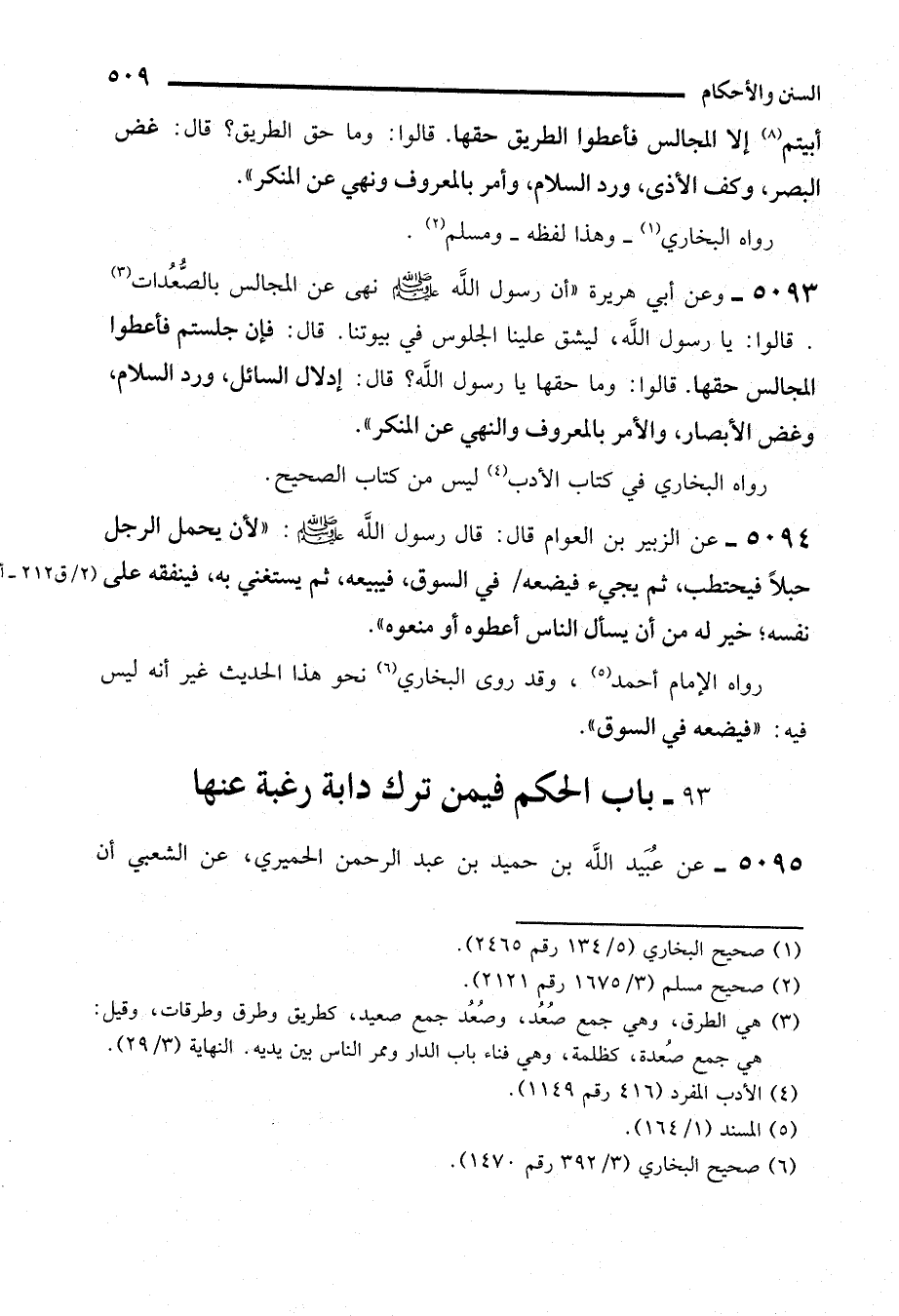 5093 - وعن أبي هريرة "أن رسول الله - صلى الله عليه وسلم - نهى عن المجالس بالصُّعُدات (¬3) قالوا: يا رسول الله، ليشق علينا الجلوس في بيوتنا. قال: فإن جلستم فأعطوا المجالس حقها. قالوا: وما حقها يا رسول الله؟ قال: إدلال السائل، ورد السلام، وغض الأبصار، والأمر بالمعروف والنهي عن المنكر".