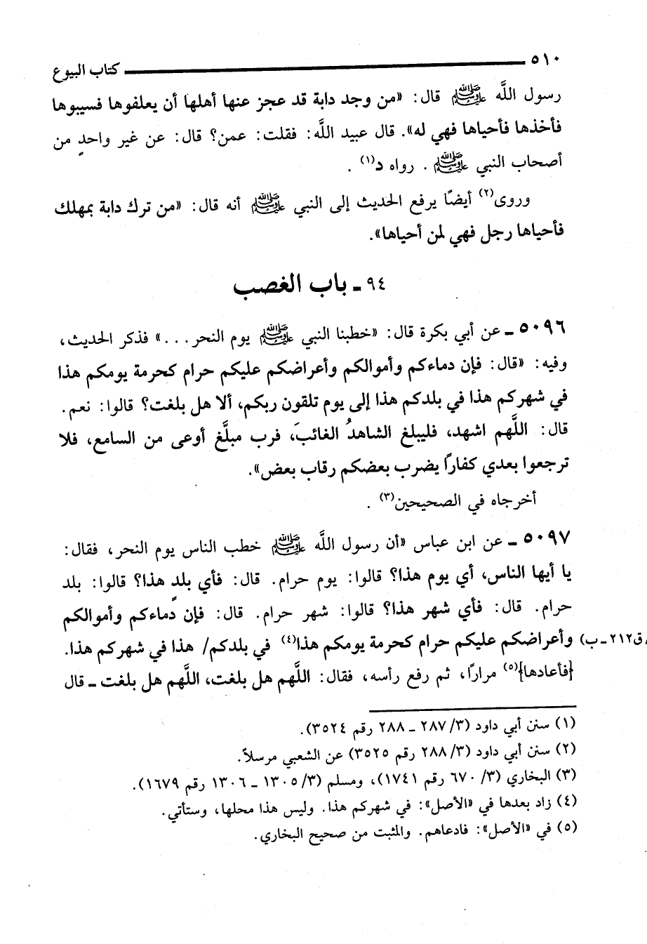 5096 - عن أبي بكرة قال: "خطبنا النبي - صلى الله عليه وسلم - يوم النحر ... " فذكر الحديث، وفيه: "قال: فإن دماءكم وأموالكم وأعراضكم عليكم حرام كحرمة يومكم هذا في شهركم هذا في بلدكم هذا إلى يوم تلقون ربكم، ألا هل بلغت؟ قالوا: نعم. قال: اللهم اشهد، فليبلغ الشاهدُ الغائبَ، فرب مبلَّغ أوعى من السامع، فلا ترجعوا بعدي كفارًا يضرب بعضكم رقاب بعض".